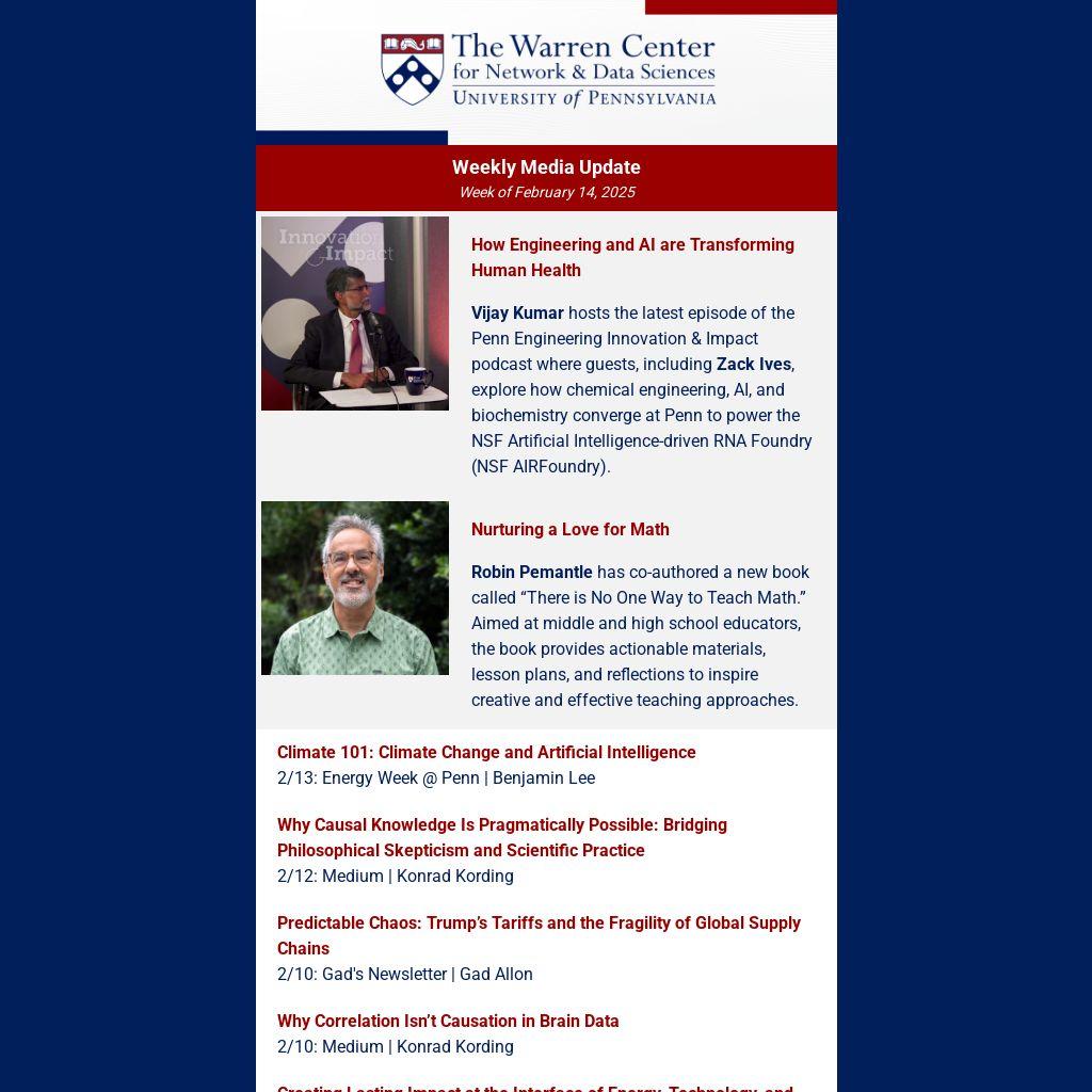 Vijay Kumar hosts the latest episode of the Penn Engineering Innovation & Impact podcast where guests, including Zack Ives, explore how chemical engineering, AI, and biochemistry converge at Penn to power the NSF Artificial Intelligence-driven RNA Foundry (NSF AIRFoundry).
