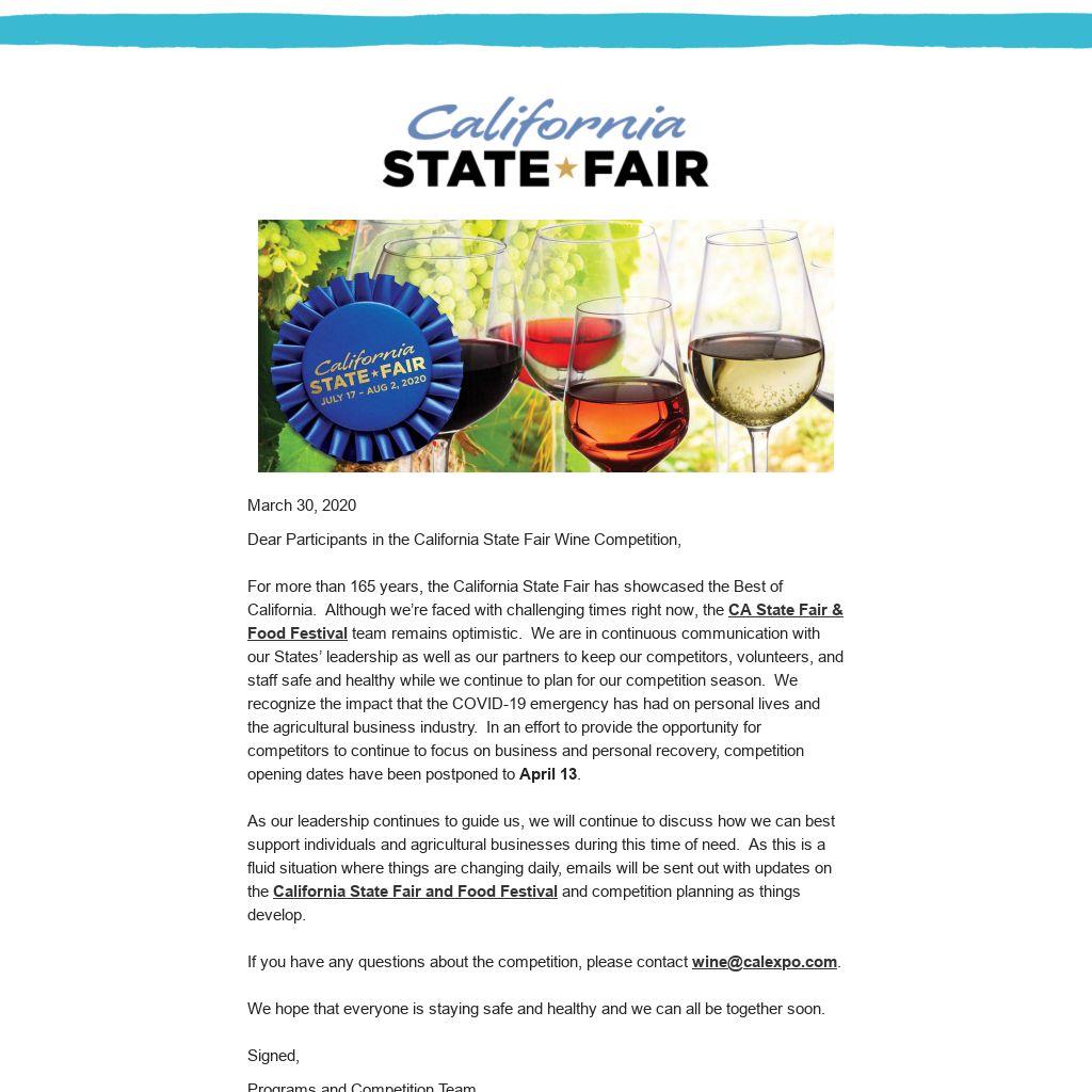 Dear Participants in the California State Fair Wine Competition, For more than 165 years, the California State Fair has showcased the Best of California. Although we’re faced with challenging times right now, the CA State Fair & Food Festival team remains optimistic. We are in continuous communication with our States’ leadership as well as our partners to keep our competitors, volunteers, and staff safe and healthy while we continue to plan for our competition season. We recognize the impact that the COVID-19 emergency has had on personal lives and the agricultural business industry. In an effort to provide the opportunity for competitors to continue to focus on business and personal recovery, competition opening dates have been postponed to April 13. As our leadership continues to guide us, we will continue to discuss how we can best support individuals and agricultural businesses during this time of need. As this is a fluid situation where things are changing daily, emails will be sent out with updates on the California State Fair and Food Festival and competition planning as things develop. If you have any questions about the competition, please contact wine@calexpo.com.