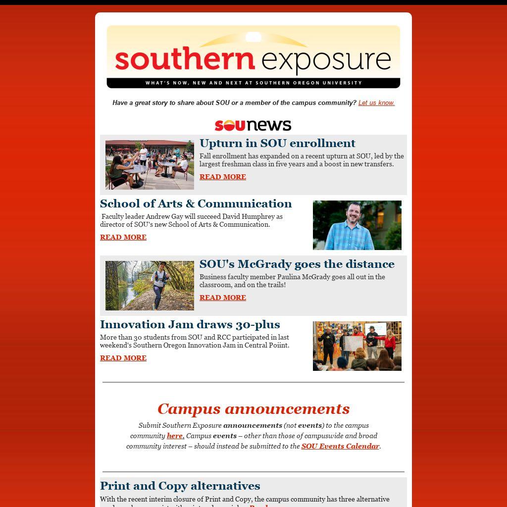 Submit Southern Exposure announcements (not events) to the campus community here. Campus events – other than those of campuswide and broad community interest – should instead be submitted to the SOU Events Calendar.
