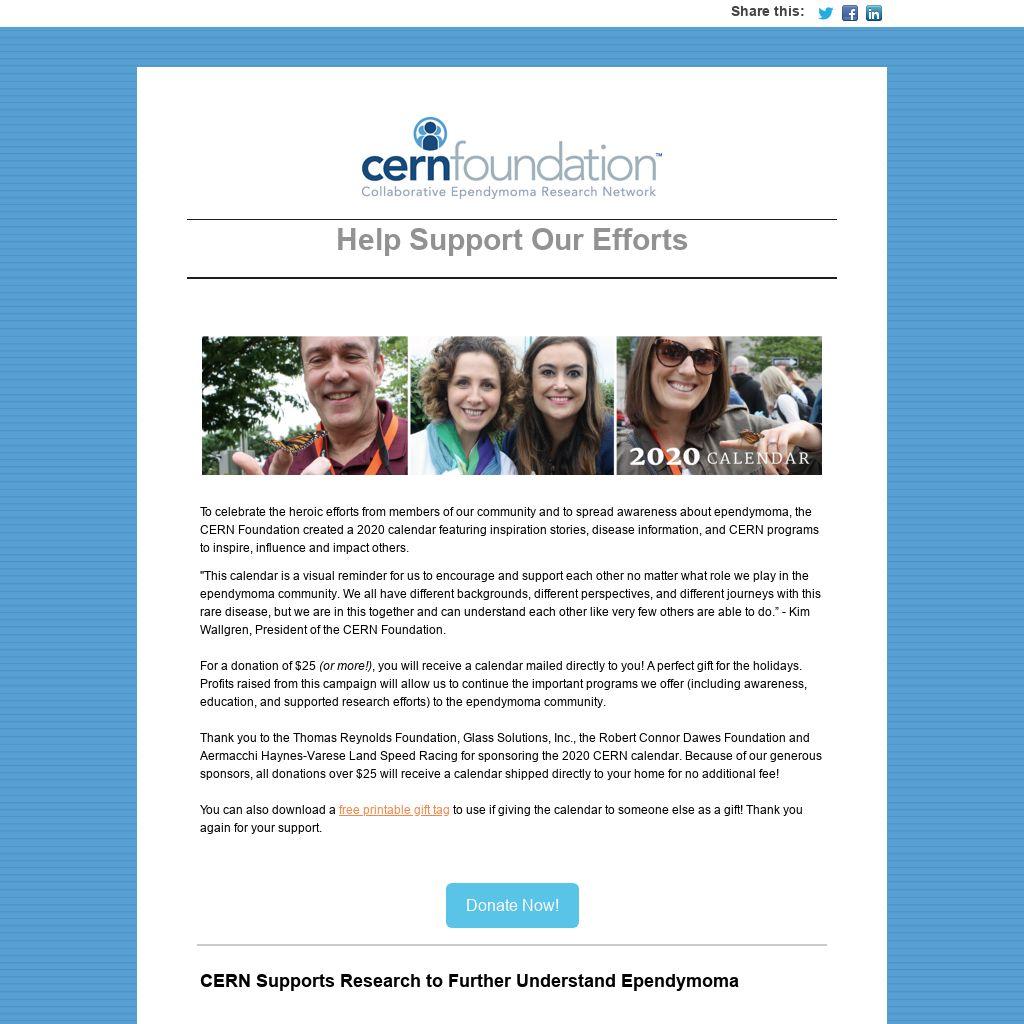 To celebrate the heroic efforts from members of our community and to spread awareness about ependymoma, the CERN Foundation created a 2020 calendar featuring inspiration stories, disease information, and CERN programs to inspire, influence and impact others.