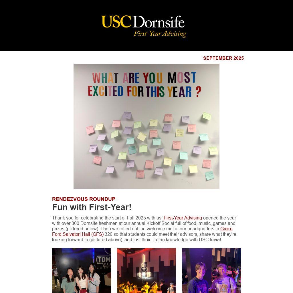 Thank you for celebrating the start of Fall 2025 with us! First-Year Advising opened the year with over 300 Dornsife freshmen at our annual Kickoff Social full of food, music, games and prizes (pictured below). Then we rolled out the welcome mat at our headquarters in Grace Ford Salvatori Hall (GFS) 320 so that students could meet their advisors, share what they're looking forward to (pictured above), and test their Trojan knowledge with USC trivia!