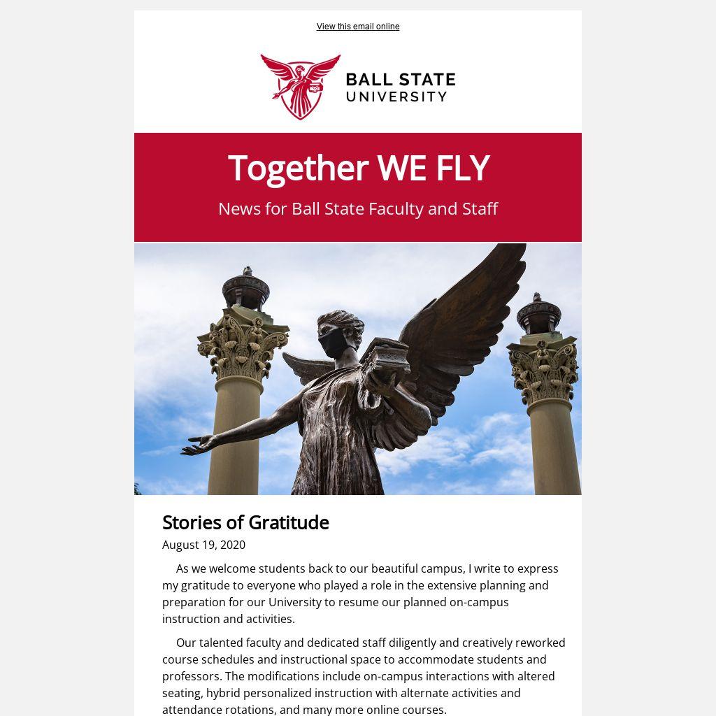 These are just a few of many examples of how our faculty and staff have remained committed to our vital mission. This upcoming semester will be different from a typical year. But thanks to your hard work and devotion, we will continue to provide our students with the high-quality educational experiences they value at Ball State.