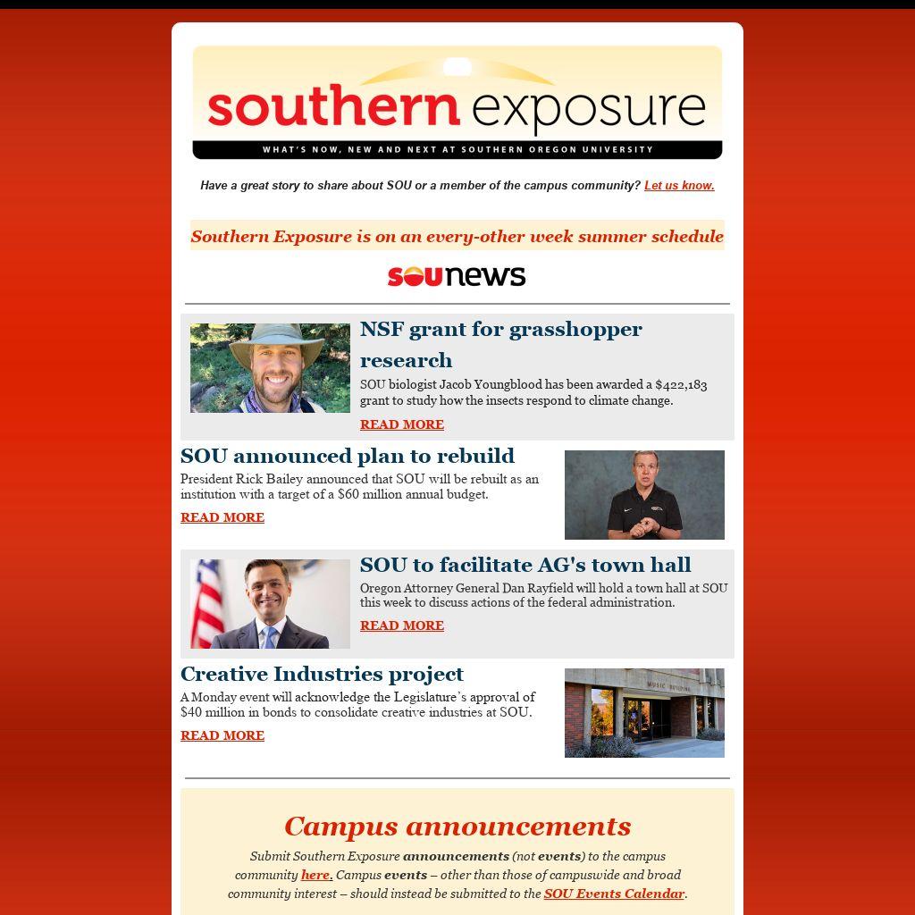 Submit Southern Exposure announcements (not events) to the campus community here. Campus events – other than those of campuswide and broad community interest – should instead be submitted to the SOU Events Calendar.