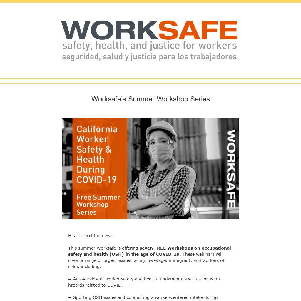 This summer Worksafe is offering seven FREE workshops on occupational safety and health (OSH) in the age of COVID-19. These webinars will cover a range of urgent issues facing low-wage, immigrant, and workers of color, including: