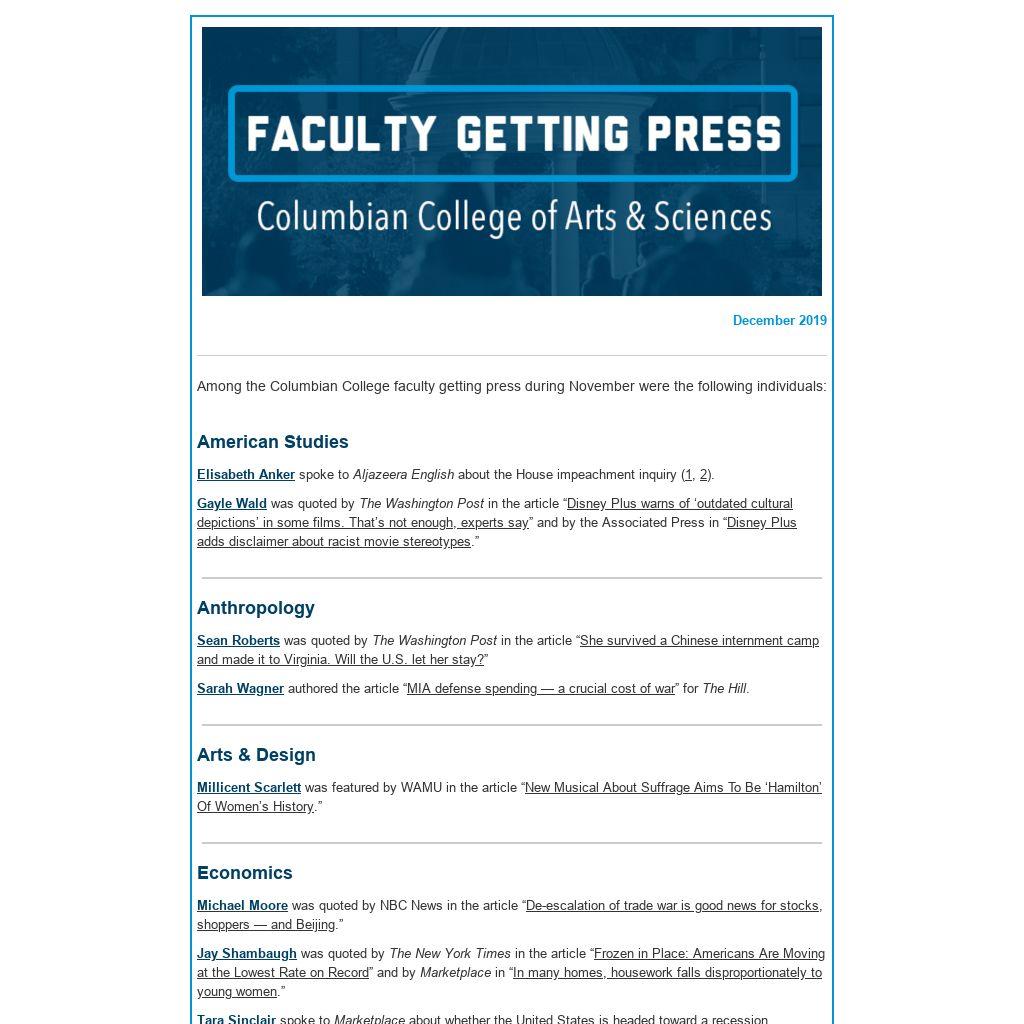 Among the Columbian College faculty getting press during November were the following individuals: