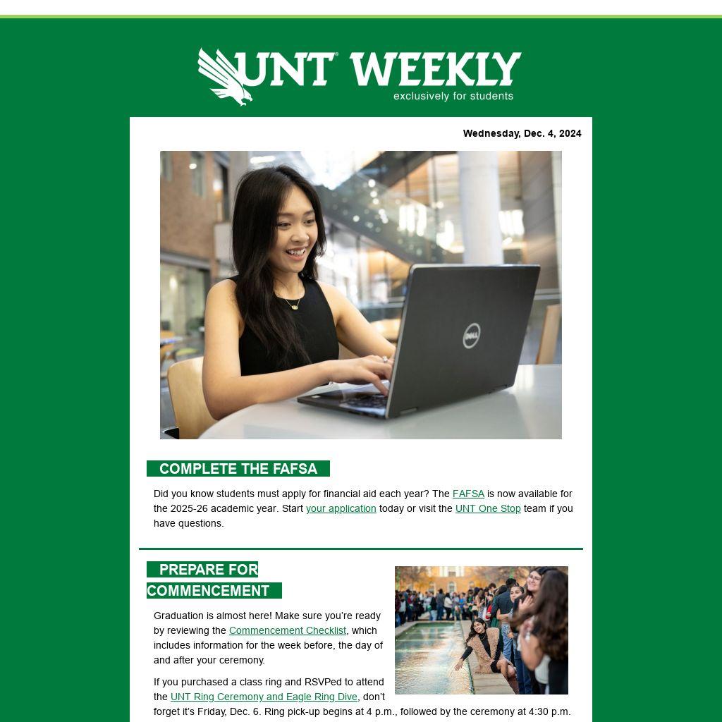 Did you know students must apply for financial aid each year? The FAFSA is now available for the 2025-26 academic year. Start your application today or visit the UNT One Stop team if you have questions.