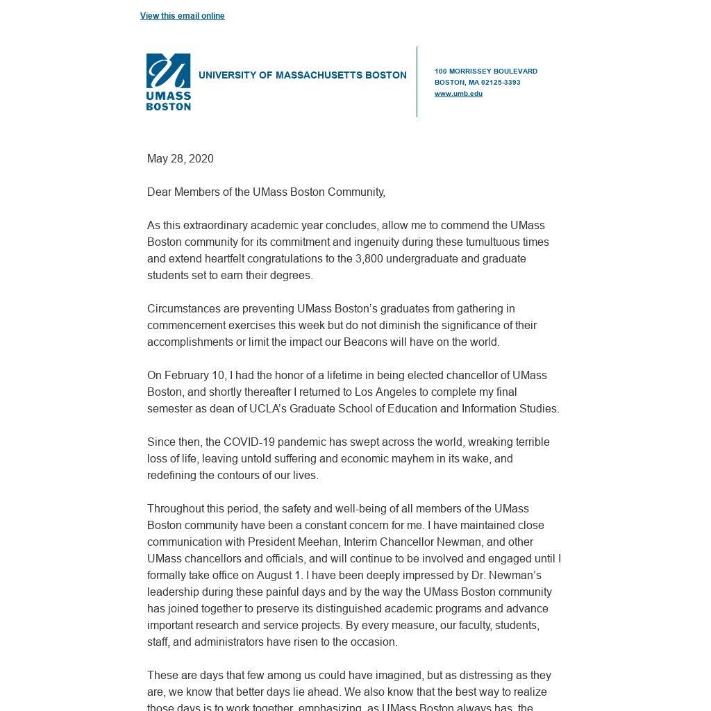 These are days that few among us could have imagined, but as distressing as they are, we know that better days lie ahead. We also know that the best way to realize those days is to work together, emphasizing, as UMass Boston always has, the paramount importance of reason, collaboration, and compassion. I look forward to being with you soon and joining you in the journey to our brighter future.