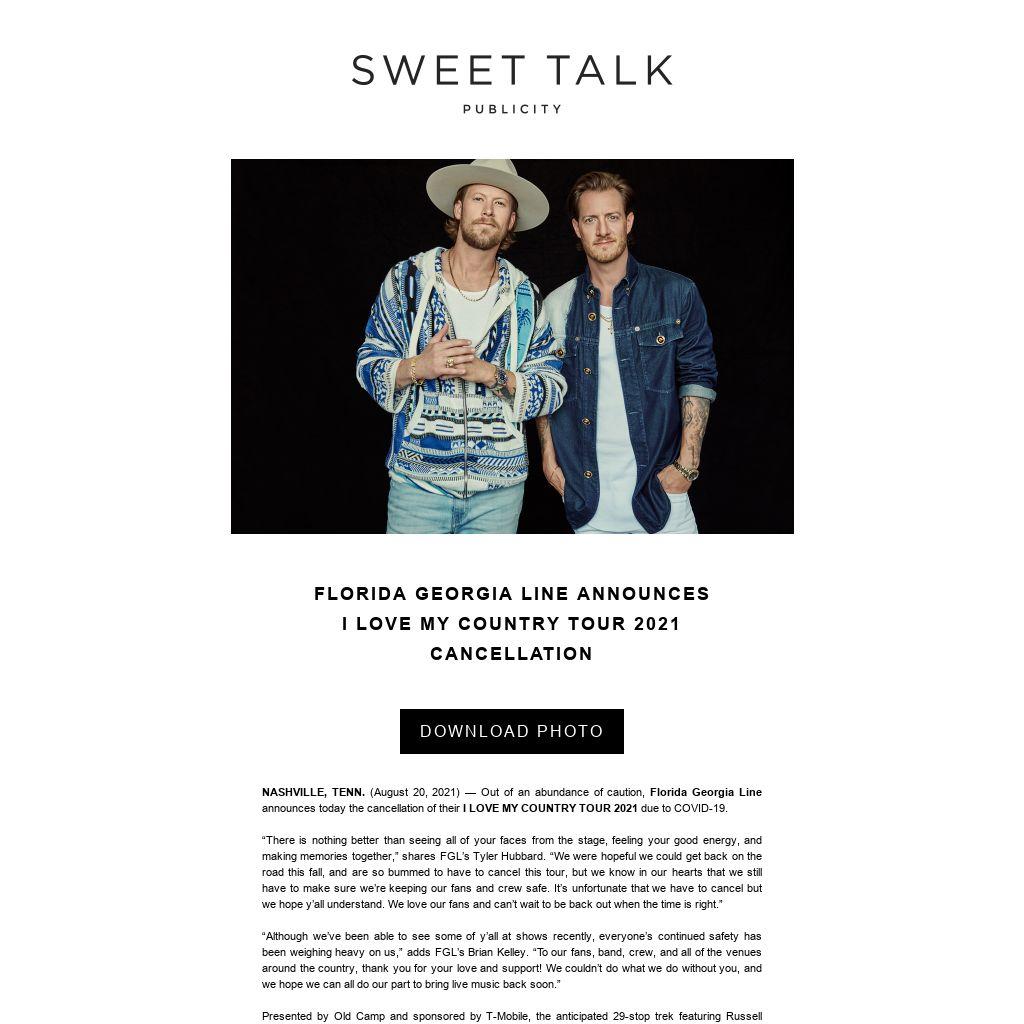 NASHVILLE, TENN. (August 20, 2021) — Out of an abundance of caution, Florida Georgia Line announces today the cancellation of their I LOVE MY COUNTRY TOUR 2021 due to COVID-19.