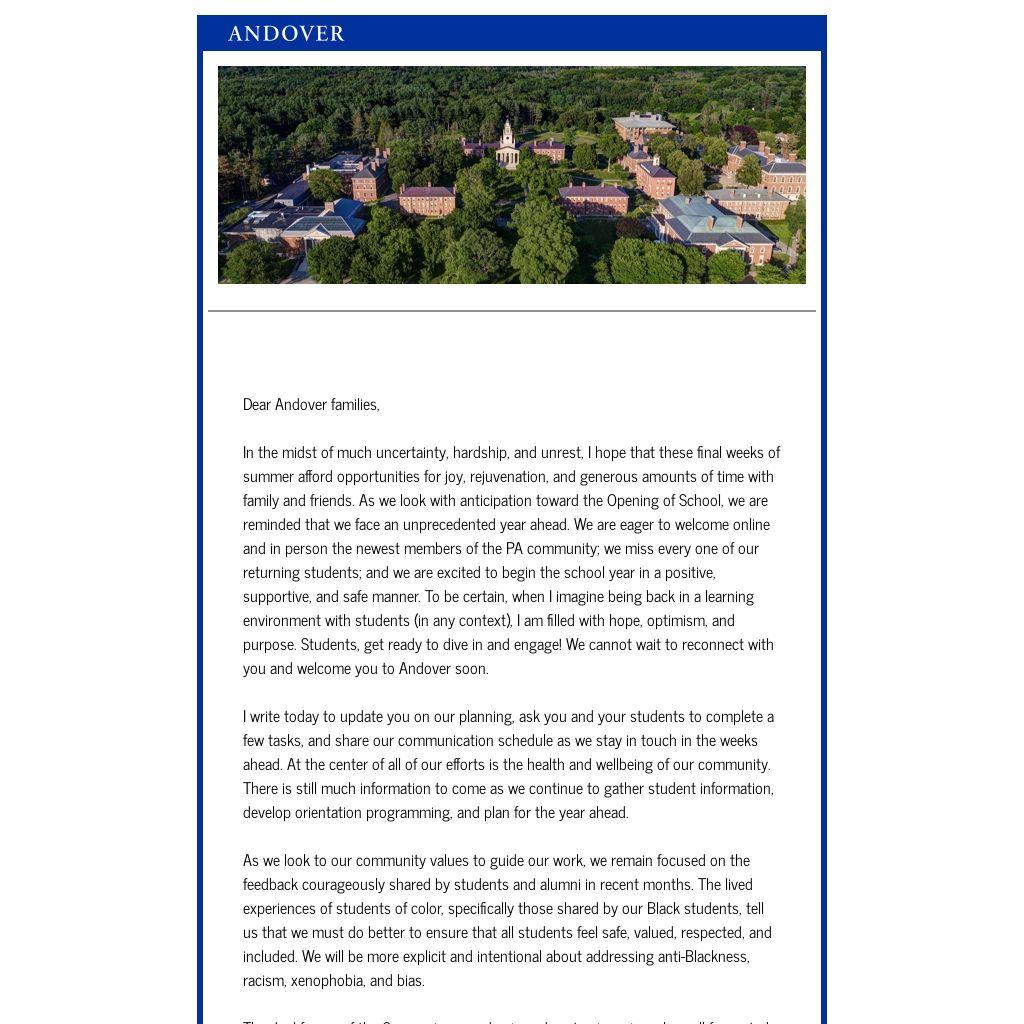In the midst of much uncertainty, hardship, and unrest, I hope that these final weeks of summer afford opportunities for joy, rejuvenation, and generous amounts of time with family and friends. As we look with anticipation toward the Opening of School, we are reminded that we face an unprecedented year ahead. We are eager to welcome online and in person the newest members of the PA community; we miss every one of our returning students; and we are excited to begin the school year in a positive, supportive, and safe manner. To be certain, when I imagine being back in a learning environment with students (in any context), I am filled with hope, optimism, and purpose. Students, get ready to dive in and engage! We cannot wait to reconnect with you and welcome you to Andover soon.