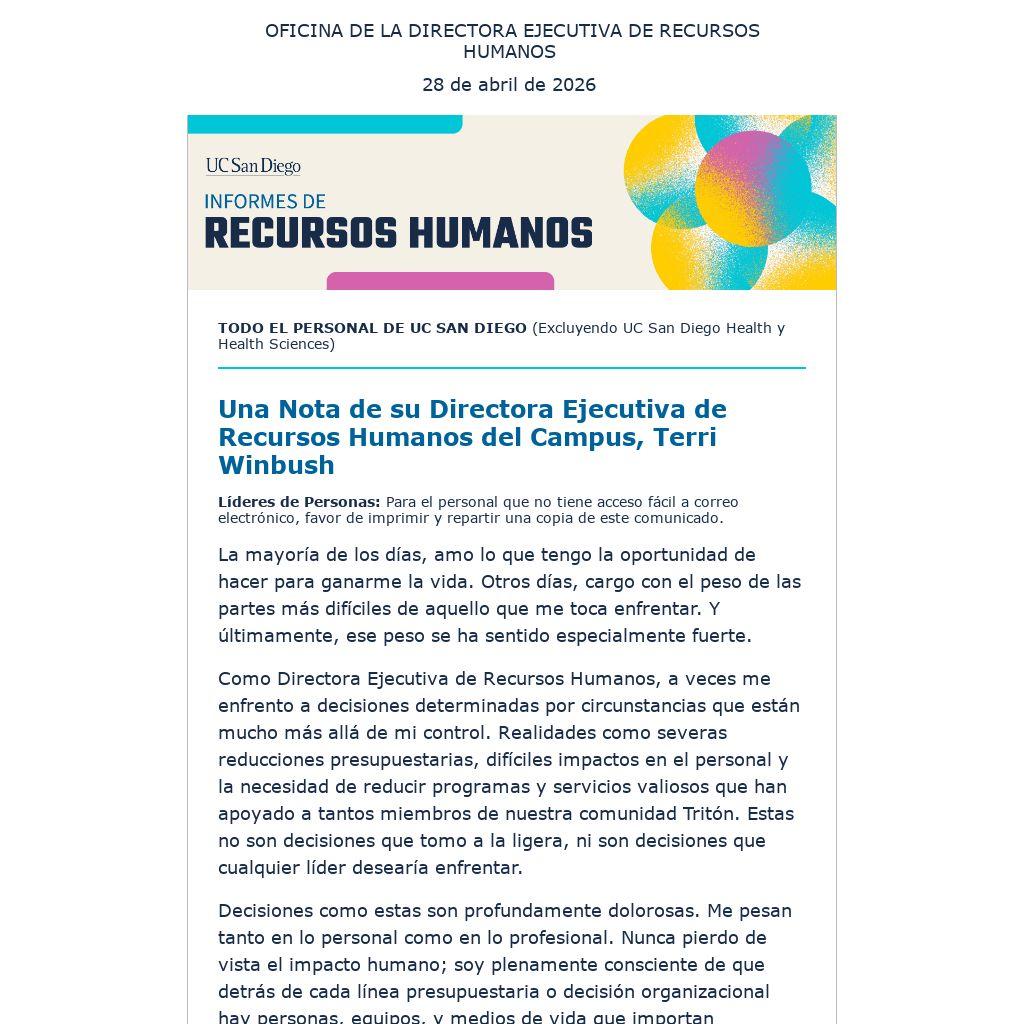 Como Directora Ejecutiva de Recursos Humanos, a veces me enfrento a decisiones determinadas por circunstancias que están mucho más allá de mi control. Realidades como severas reducciones presupuestarias, difíciles impactos en el personal y la necesidad de reducir programas y servicios valiosos que han apoyado a tantos miembros de nuestra comunidad Tritón. Estas no son decisiones que tomo a la ligera, ni son decisiones que cualquier líder desearía enfrentar.