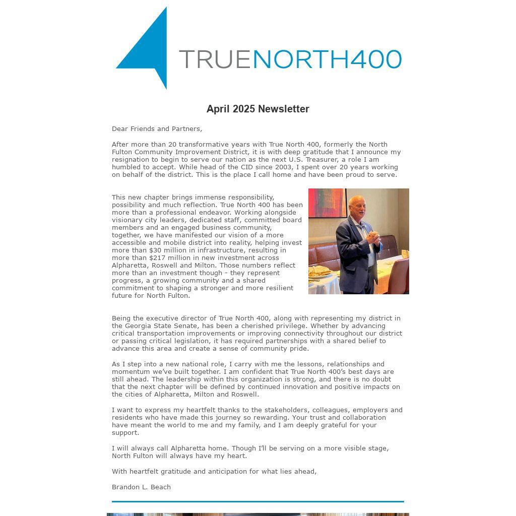 This new chapter brings immense responsibility, possibility and much reflection. True North 400 has been more than a professional endeavor. Working alongside visionary city leaders, dedicated staff, committed board members and an engaged business community, together, we have manifested our vision of a more accessible and mobile district into reality, helping invest more than $30 million in infrastructure, resulting in more than $217 million in new investment across Alpharetta, Roswell and Milton. Those numbers reflect more than an investment though - they represent progress, a growing community and a shared commitment to shaping a stronger and more resilient future for North Fulton.