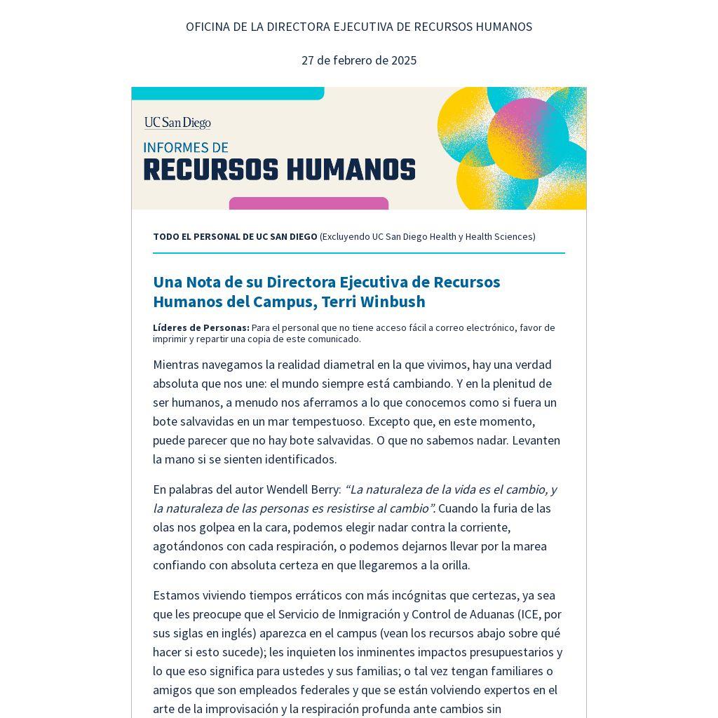 - Nuestra prioridad es comunicarnos con ustedes y proporcionarles actualizaciones e información en cuanto las recibimos de Recursos Humanos a nivel del sistema y de la Oficina del Presidente de la UC, lo más rápido posible.