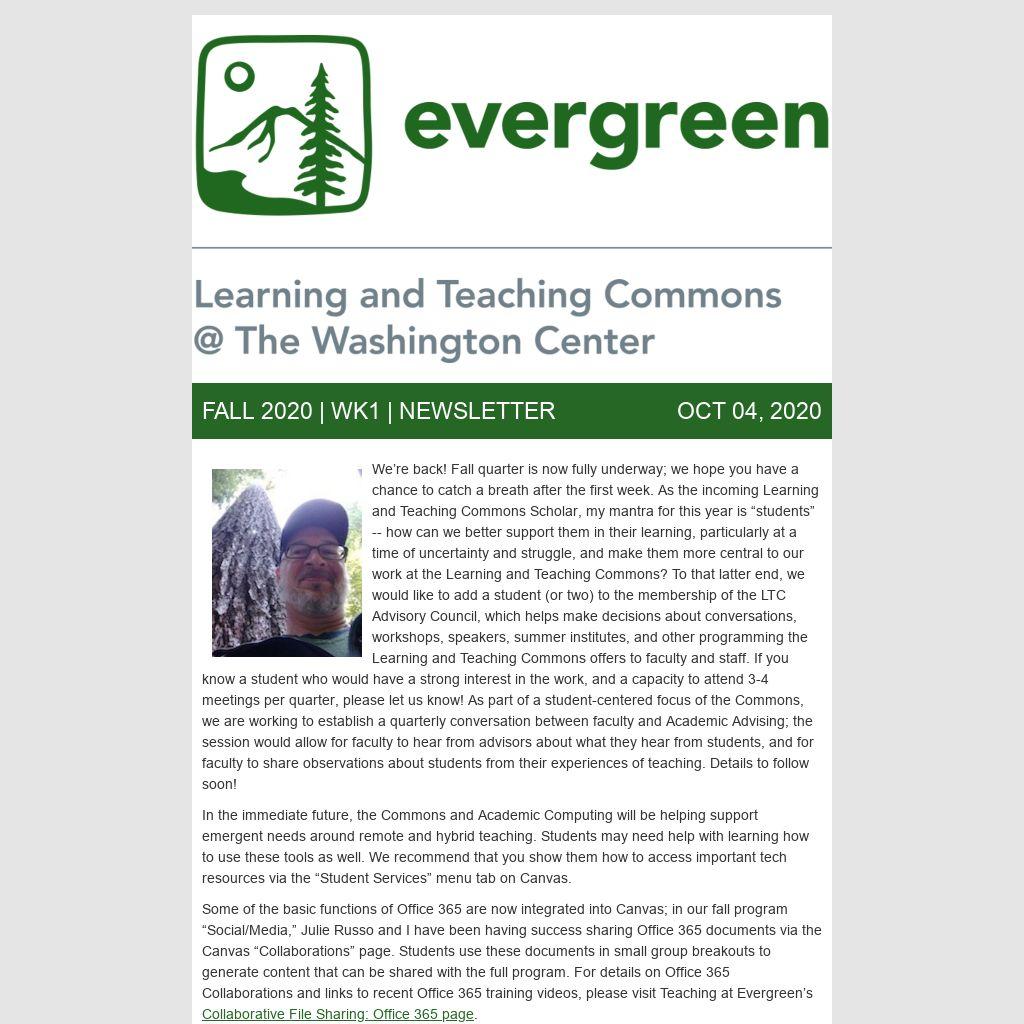 We’re back! Fall quarter is now fully underway; we hope you have a chance to catch a breath after the first week. As the incoming Learning and Teaching Commons Scholar, my mantra for this year is “students” -- how can we better support them in their learning, particularly at a time of uncertainty and struggle, and make them more central to our work at the Learning and Teaching Commons? To that latter end, we would like to add a student (or two) to the membership of the LTC Advisory Council, which helps make decisions about conversations, workshops, speakers, summer institutes, and other programming the Learning and Teaching Commons offers to faculty and staff. If you know a student who would have a strong interest in the work, and a capacity to attend 3-4 meetings per quarter, please let us know! As part of a student-centered focus of the Commons, we are working to establish a quarterly conversation between faculty and Academic Advising; the session would allow for faculty to hear from advisors about what they hear from students, and for faculty to share observations about students from their experiences of teaching. Details to follow soon!