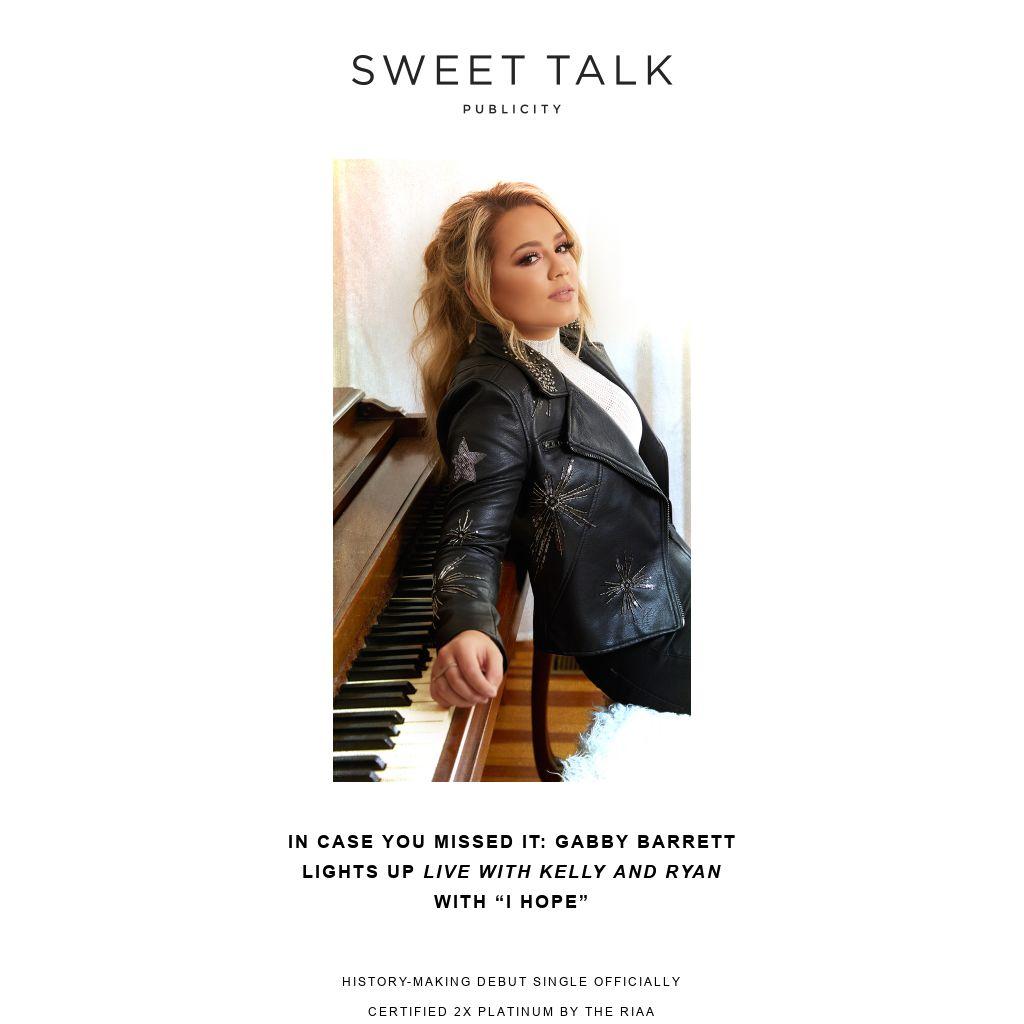 Warner Music Nashville’s Gabby Barrett is setting the trend. With her debut single “I Hope,” Barrett became the first-ever female artist with a Country song to log over 10 MILLION on-demand streams in a single week with 11.3 MILLION, adding to her over 400 MILLION on-demand streams. The "lightning-in-a-bottle single" (PEOPLE) raced to #16 on Billboard's Hot 100 Chart, making history as the first solo female debut single to reach Country radio’s summit since 2017 and the youngest artist to debut with a #1 in over two decades. Spotlighted as a SiriusXM + Pandora All-Genre and Country Artist to Watch, Radio Disney’s Next Big Thing, and Amazon Music’s Weekly One best performing Country female of 2019, she continues to rise through the ranks as “country music's rising star” (E!). “A voice you must hear,” (The Pittsburgh Tribune-Review) the ACM New Female Artist of the Year nominee has opened for Dierks Bentley, Kane Brown, Luke Bryan, Toby Keith, Chris Lane, Dustin Lynch, Jake Owen, Bebe Rexha, Cole Swindell, Sugarland, and Carrie Underwood. Her debut album, GOLDMINE, is out now, featuring sophomore single “The Good Ones” and a crossover remix of “I Hope” feat. Charlie Puth.