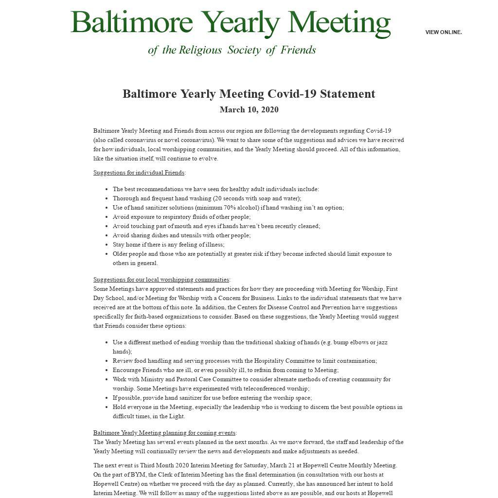Baltimore Yearly Meeting and Friends from across our region are following the developments regarding Covid-19 (also called coronavirus or novel coronavirus). We want to share some of the suggestions and advices we have received for how individuals, local worshipping communities, and the Yearly Meeting should proceed. All of this information, like the situation itself, will continue to evolve.