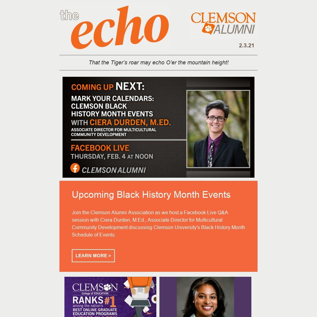 The Clemson Alumni Association will be sharing regular updates with the Clemson Family via email. Update your contact information to make sure you are receiving these updates.
