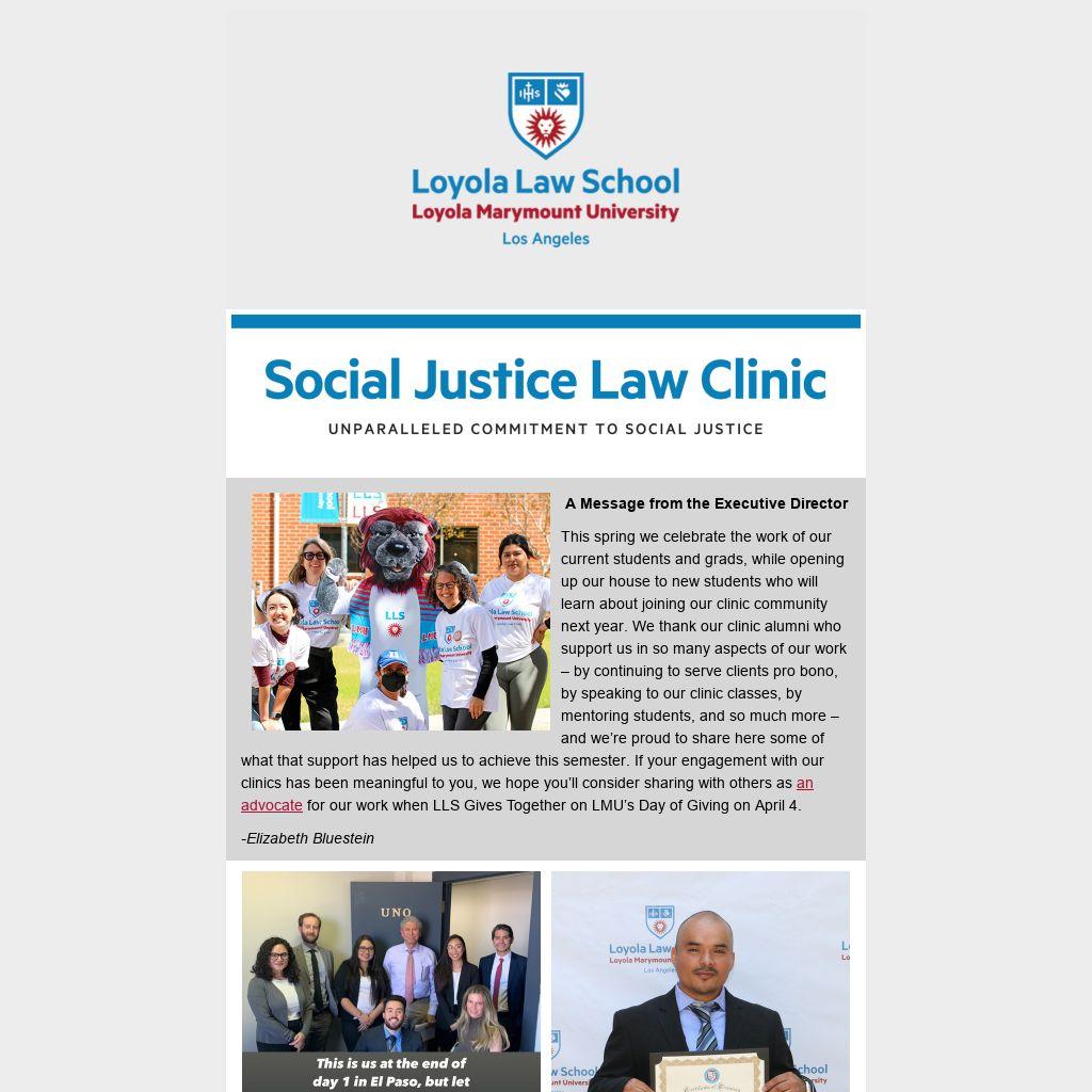 April 4, 2023: Support LSJLC During LLS' Day of Giving During this year’s annual Day of Giving on April 4, 2023, we are asking for your support of a clinic whose work is meaningful to you or for your support of the Loyola Social Justice Law Clinic as a whole so that we are further equipped to provide legal services in the areas of greatest need. LLS Gives Together is about uplifting and supporting the programs most meaningful to you, while inspiring others to do the same. Learn more and sign up to participate! LLS Gives Together on April 4. Join here.