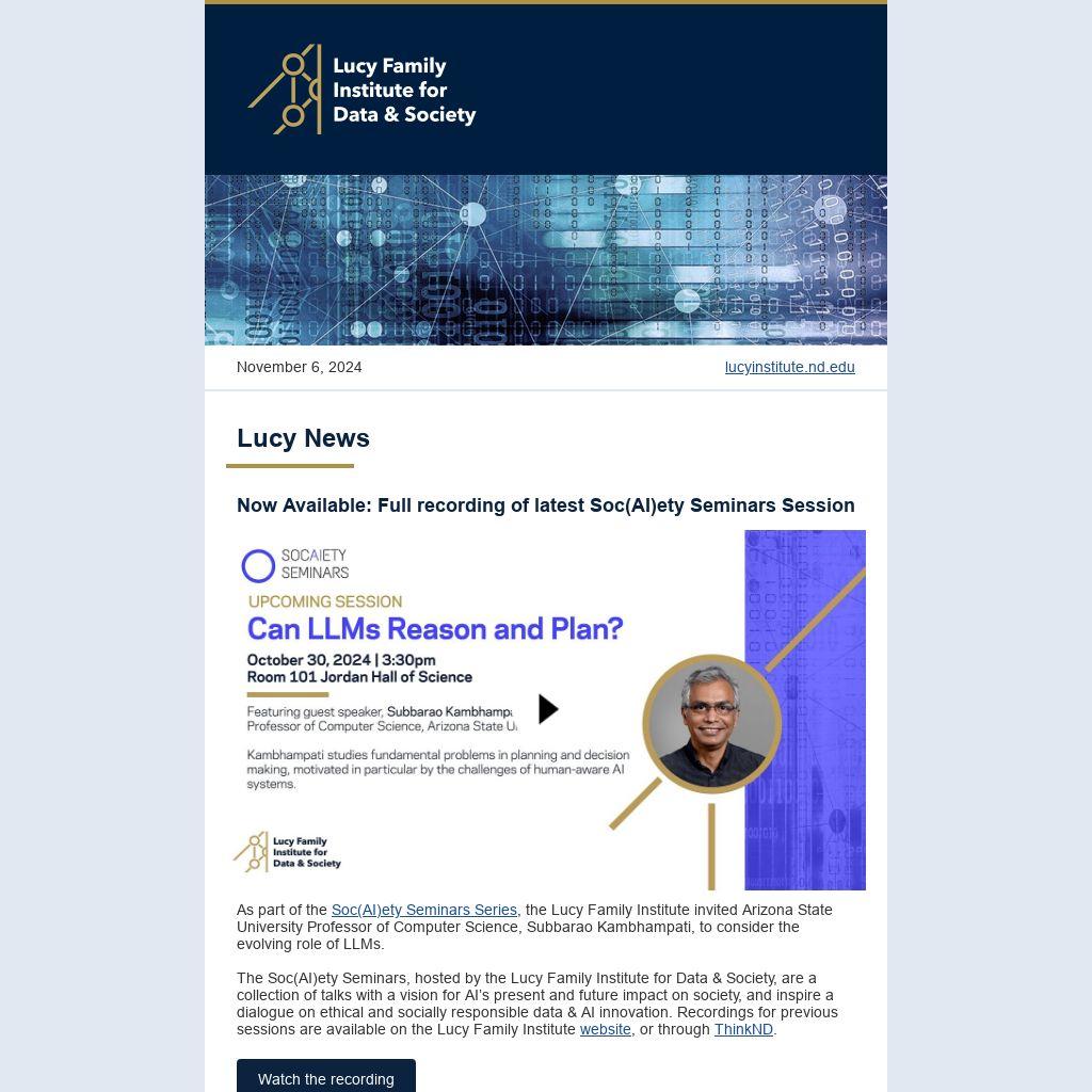 The Soc(AI)ety Seminars, hosted by the Lucy Family Institute for Data & Society, are a collection of talks with a vision for AI’s present and future impact on society, and inspire a dialogue on ethical and socially responsible data & AI innovation. Recordings for previous sessions are available on the Lucy Family Institute website, or through ThinkND.