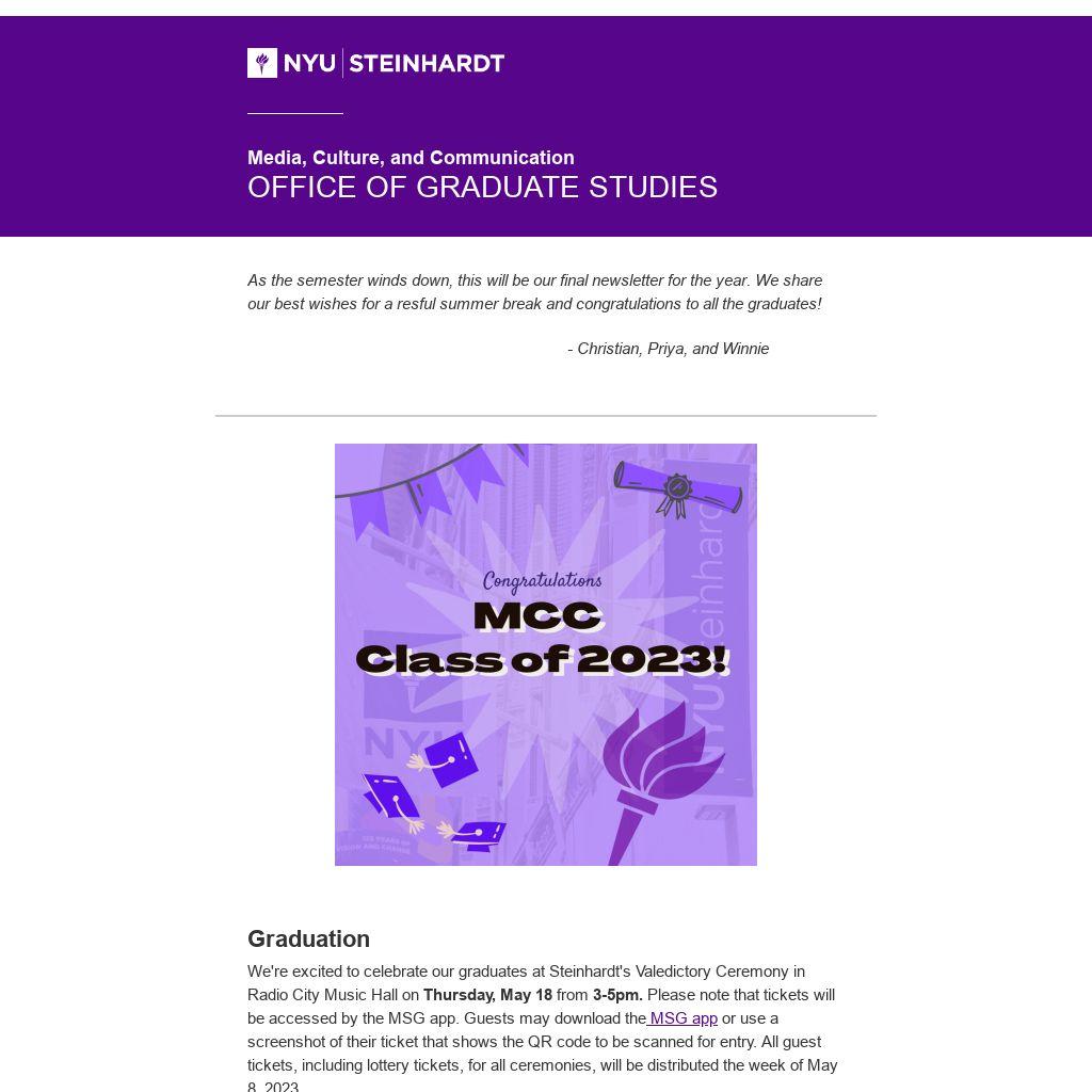 We're excited to celebrate our graduates at Steinhardt's Valedictory Ceremony in Radio City Music Hall on Thursday, May 18 from 3-5pm. Please note that tickets will be accessed by the MSG app. Guests may download the MSG app or use a screenshot of their ticket that shows the QR code to be scanned for entry. All guest tickets, including lottery tickets, for all ceremonies, will be distributed the week of May 8, 2023.