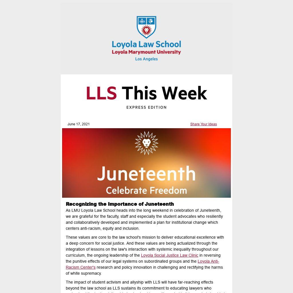As LMU Loyola Law School heads into the long weekend in celebration of Juneteenth, we are grateful for the faculty, staff and especially the student advocates who resiliently and collaboratively developed and implemented a plan for institutional change which centers anti-racism, equity and inclusion.