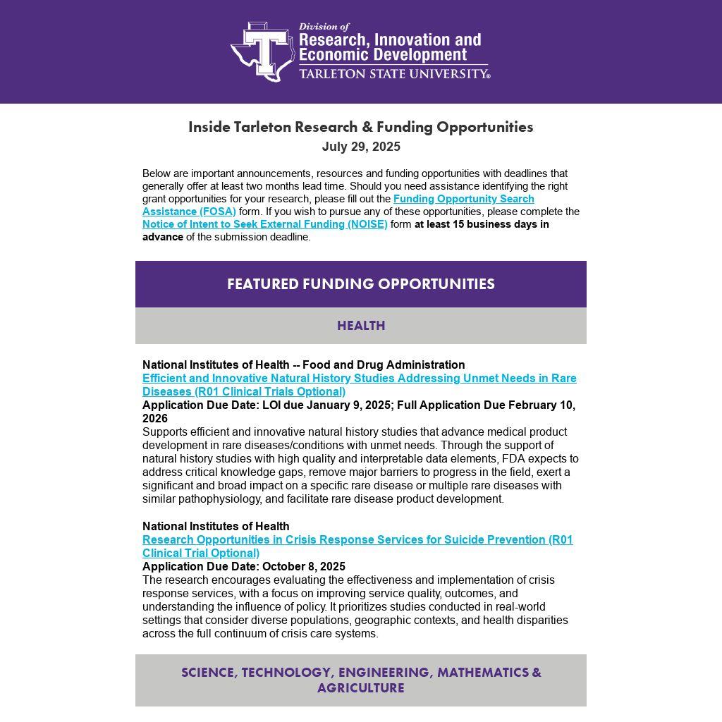 Below are important announcements, resources and funding opportunities with deadlines that generally offer at least two months lead time. Should you need assistance identifying the right grant opportunities for your research, please fill out the Funding Opportunity Search Assistance (FOSA) form. If you wish to pursue any of these opportunities, please complete the Notice of Intent to Seek External Funding (NOISE) form at least 15 business days in advance of the submission deadline.