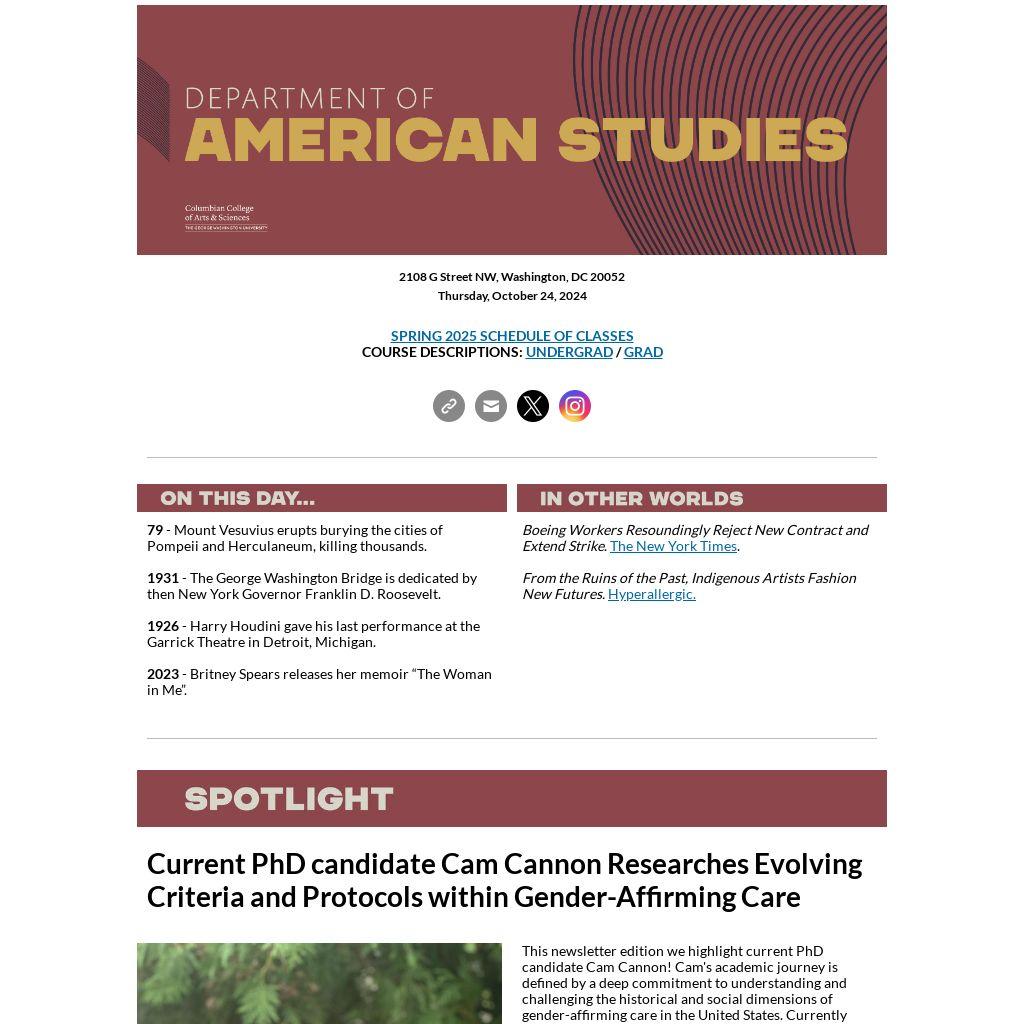 This newsletter edition we highlight current PhD candidate Cam Cannon! Cam's academic journey is defined by a deep commitment to understanding and challenging the historical and social dimensions of gender-affirming care in the United States. Currently immersed in their doctoral research here at GW, Cam is delving into the intricate evolution of diagnostic criteria and treatment protocols within the realm of gender-affirming care. Their dissertation, tentatively titled “Standard: Trans Activism and the History of Gender-Affirming Care in the U.S.,” seeks to unravel the complex journey of these protocols from the world of sexology to their influence in U.S. legal, carceral, and political systems. Before beginning their doctoral work, Cam wrote a bit about surveillance, consumerism, and labor, which you can check out online in the archives of Real Life magazine.