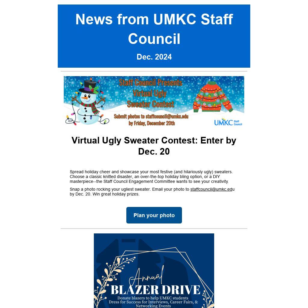 Snap a photo rocking your ugliest sweater. Email your photo to staffcouncil@umkc.edu by Dec. 20. Win great holiday prizes.