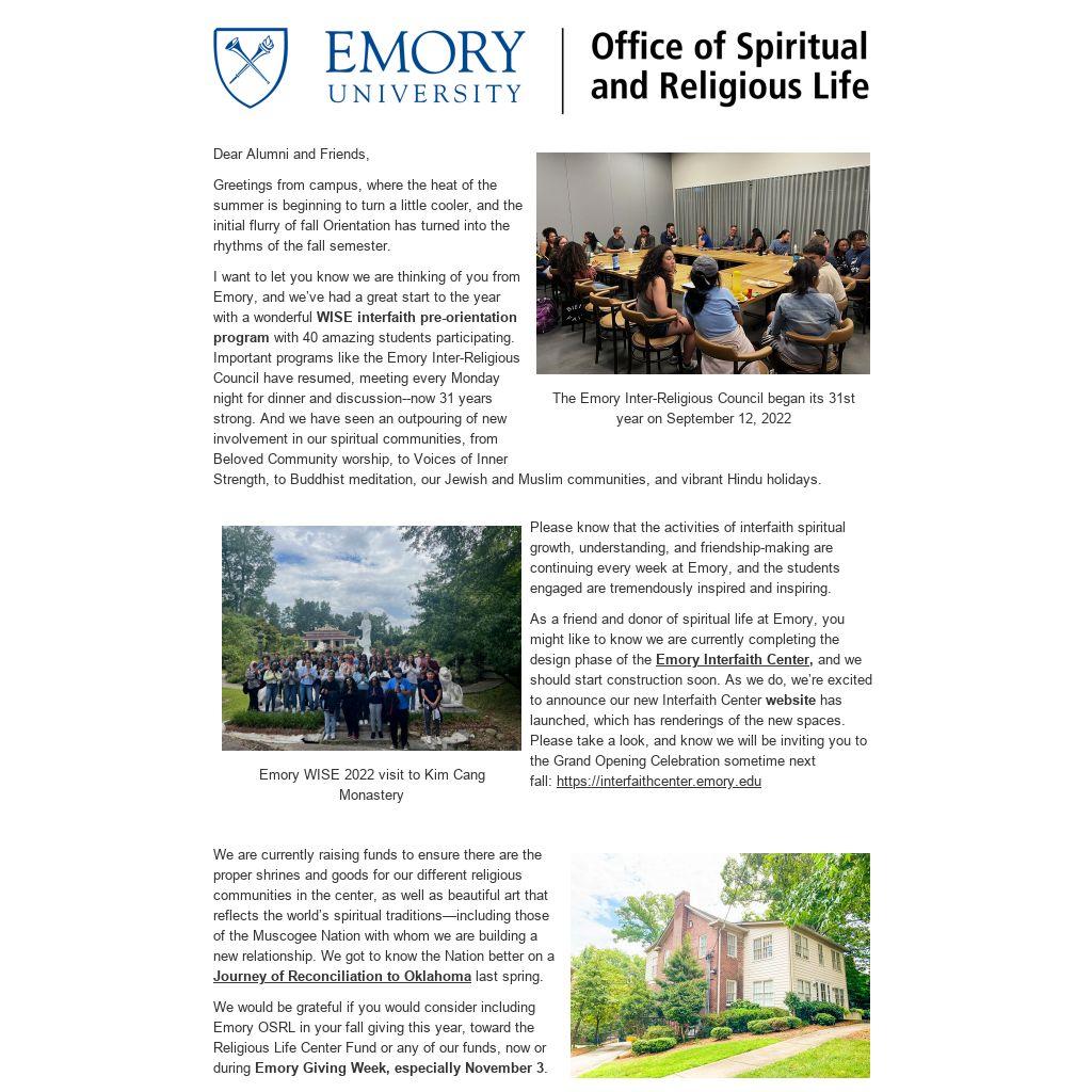 I want to let you know we are thinking of you from Emory, and we’ve had a great start to the year with a wonderful WISE interfaith pre-orientation program with 40 amazing students participating. Important programs like the Emory Inter-Religious Council have resumed, meeting every Monday night for dinner and discussion--now 31 years strong. And we have seen an outpouring of new involvement in our spiritual communities, from Beloved Community worship, to Voices of Inner Strength, to Buddhist meditation, our Jewish and Muslim communities, and vibrant Hindu holidays.