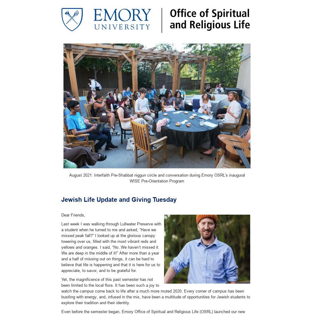 Even before the semester began, Emory Office of Spiritual and Religious Life (OSRL) launched our new pre-Orientation program, "Welcoming Interfaith and Spiritual Exploration (WISE)." Incoming Emory first-years had the opportunity to engage in fun and meaningful interfaith education, dialogue, and community visits, culminating with a Shabbat dinner and “Ask the rabbi” session that I was happy to host. In addition, OSRL began the exciting process of planning Emory’s first Interfaith Center, to open in December 2022. The college years are a unique time for developing Jewish identity, which can be strengthened by meaningful opportunities to engage with other traditions. As Giving Tuesday approaches on November 30, we would be grateful for your support of these efforts as well as your continued support for Jewish life on campus.
