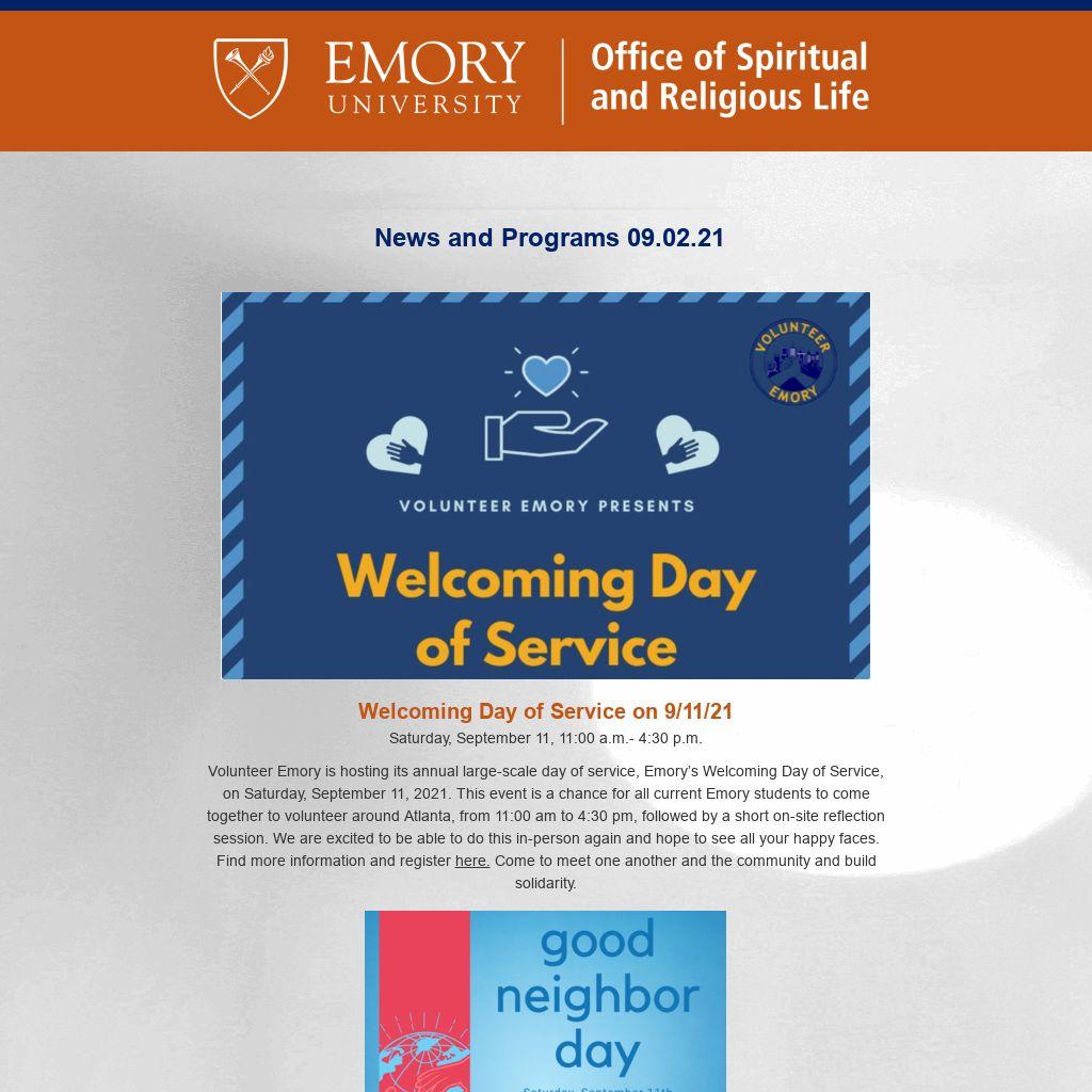 Emory OSRL Enews is published weekly during term by the Emory University Office of Spiritual and Religious Life publicizing Atlanta-campus spiritual life programs. It is not a comprehensive listing. For Oxford College spiritual life, please click here. To submit information or to update your preferences, please contact religiouslife@emory.edu.