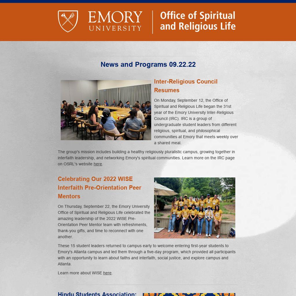 Emory OSRL ENews is published weekly during the term by the Emory University Office of Spiritual and Religious Life publicizing Atlanta-campus spiritual life programs. It is not a comprehensive listing. For Oxford College spiritual life, please click here. To submit information or to update your preferences, please contact religiouslife@emory.edu.
