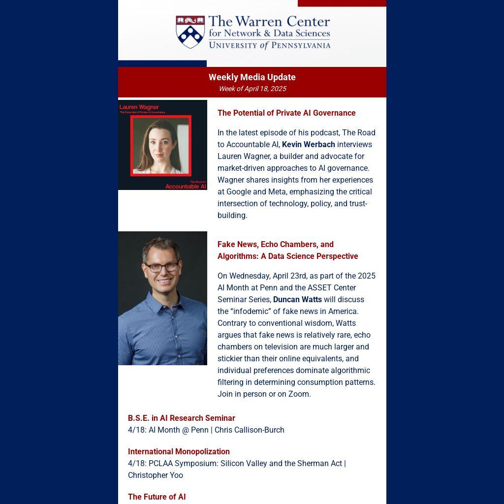 On Wednesday, April 23rd, as part of the 2025 AI Month at Penn and the ASSET Center Seminar Series, Duncan Watts will discuss the “infodemic” of fake news in America. Contrary to conventional wisdom, Watts argues that fake news is relatively rare, echo chambers on television are much larger and stickier than their online equivalents, and individual preferences dominate algorithmic filtering in determining consumption patterns. Join in person or on Zoom.