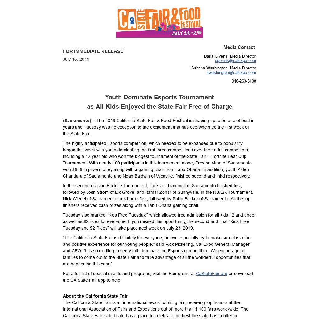“The California State Fair is definitely for everyone, but we especially try to make sure it is a fun and positive experience for our young people,” said Rick Pickering, Cal Expo General Manager and CEO. “It is so exciting to see youth dominate the Esports competition. We encourage all families to come out to the State Fair and take advantage of all the wonderful opportunities that are happening this year.”
