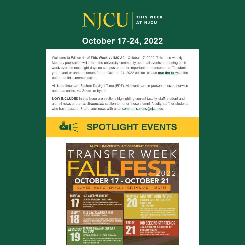 Welcome to Edition 41 of This Week at NJCU for October 17, 2022. This once-weekly Monday publication will inform the university community about all events happening each week over the next eight days on campus and offer important announcements. To submit your event or announcement for the October 24, 2022 edition, please use the form at the bottom of this communication.