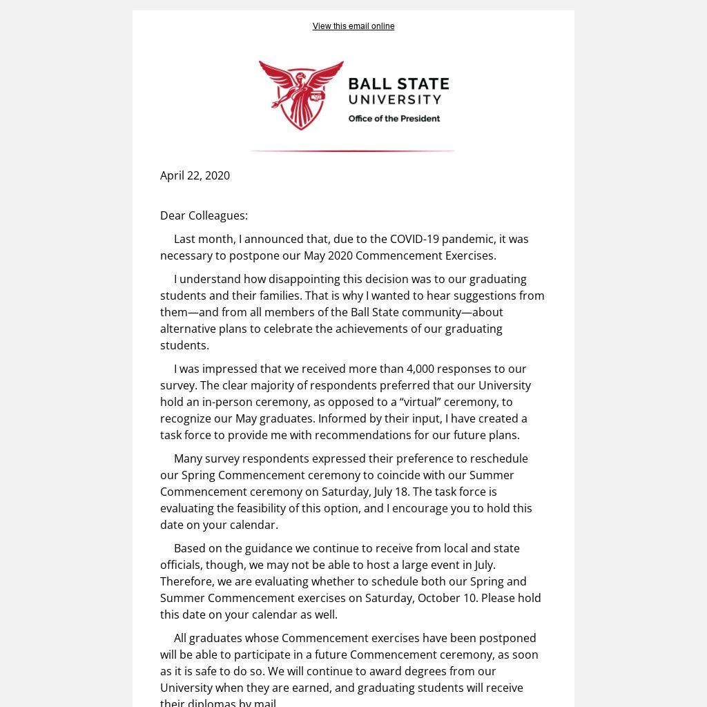 I understand how disappointing this decision was to our graduating students and their families. That is why I wanted to hear suggestions from them—and from all members of the Ball State community—about alternative plans to celebrate the achievements of our graduating students.