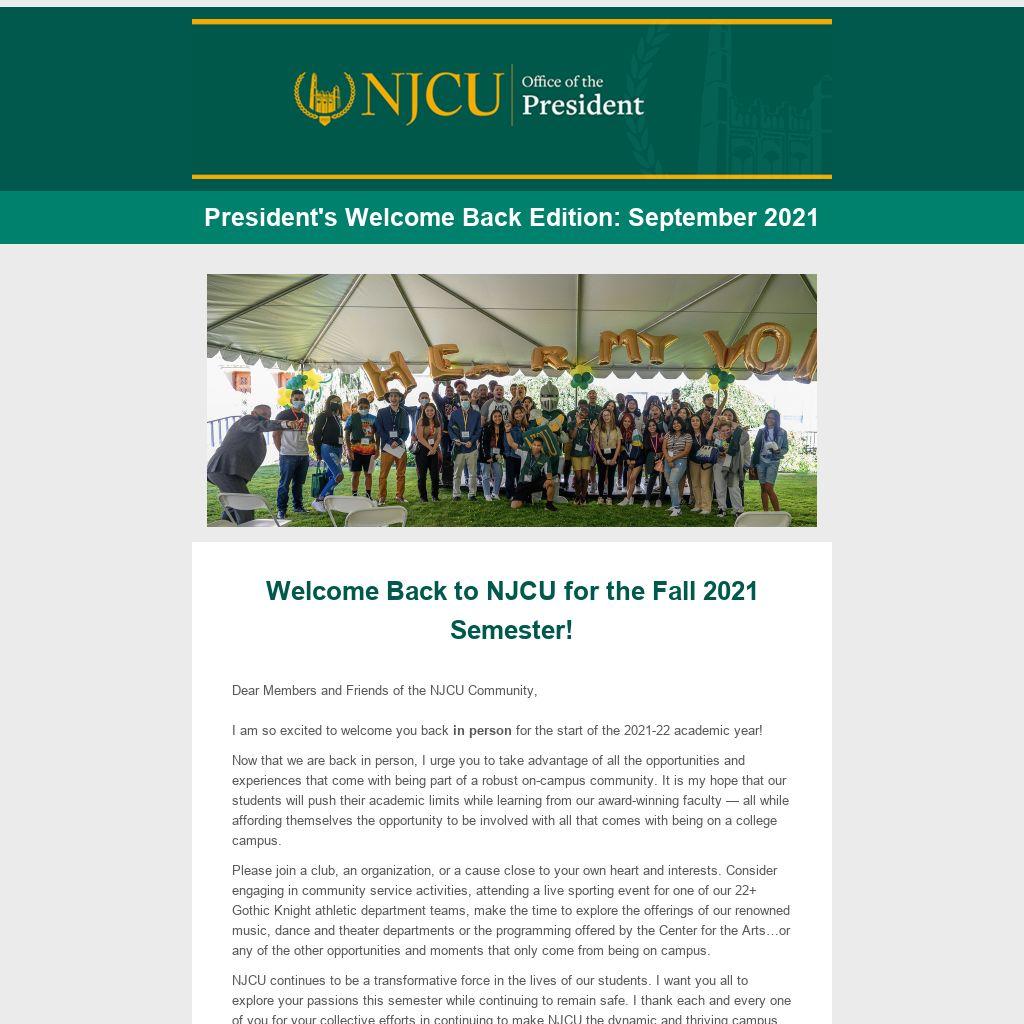 Dear Members and Friends of the NJCU Community, I am so excited to welcome you back in person for the start of the 2021-22 academic year!