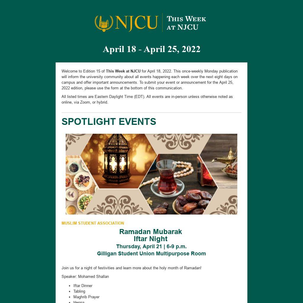 Welcome to Edition 15 of This Week at NJCU for April 18, 2022. This once-weekly Monday publication will inform the university community about all events happening each week over the next eight days on campus and offer important announcements. To submit your event or announcement for the April 25, 2022 edition, please use the form at the bottom of this communication.