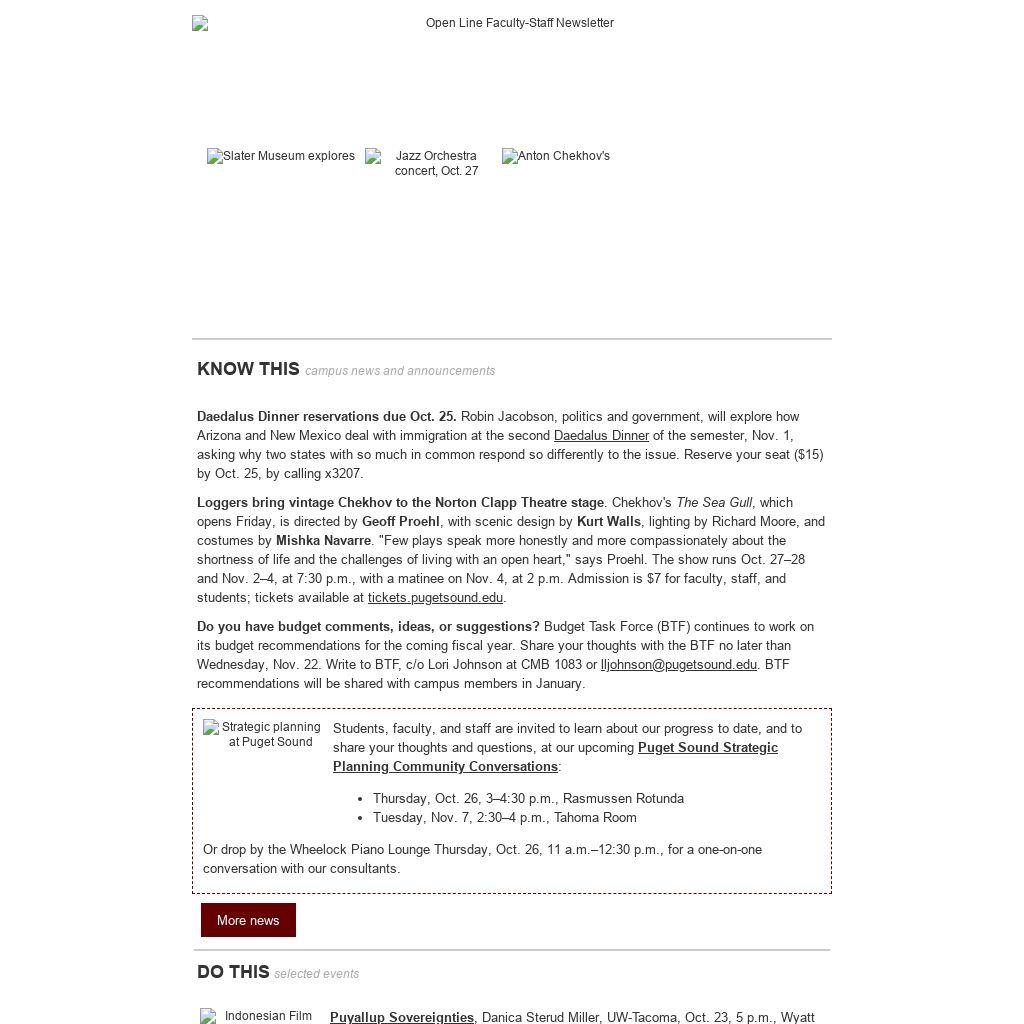 Daedalus Dinner reservations due Oct. 25. Robin Jacobson, politics and government, will explore how Arizona and New Mexico deal with immigration at the second Daedalus Dinner of the semester, Nov. 1, asking why two states with so much in common respond so differently to the issue. Reserve your seat ($15) by Oct. 25, by calling x3207. Loggers bring vintage Chekhov to the Norton Clapp Theatre stage. Chekhov's The Sea Gull, which opens Friday, is directed by Geoff Proehl, with scenic design by Kurt Walls, lighting by Richard Moore, and costumes by Mishka Navarre. " Few plays speak more honestly and more compassionately about the shortness of life and the challenges of living with an open heart," says Proehl. The show runs Oct. 27–28 and Nov. 2–4, at 7:30 p.m., with a matinee on Nov. 4, at 2 p.m. Admission is $7 for faculty, staff, and students; tickets available at tickets.pugetsound.edu. Do you have budget comments, ideas, or suggestions? Budget Task Force (BTF) continues to work on its budget recommendations for the coming fiscal year. Share your thoughts with the BTF no later than Wednesday, Nov. 22. Write to BTF, c/o Lori Johnson at CMB 1083 or lljohnson@pugetsound.edu. BTF recommendations will be shared with campus members in January.