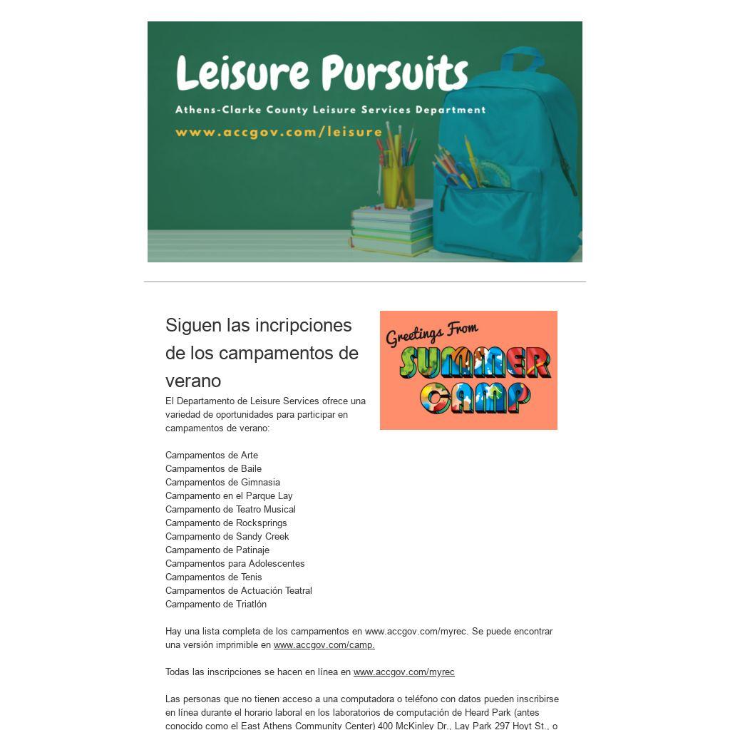 El Departamento de Leisure Services de Athens-Clarke County ofrece una selección diversa de actividades, incluyendo las artes, las ciencias ambientales, la recreación, deportes y eventos de días feriados para adultos y niños. Todas las inscripciones se hacen en línea en www.accgov.com/myrec .