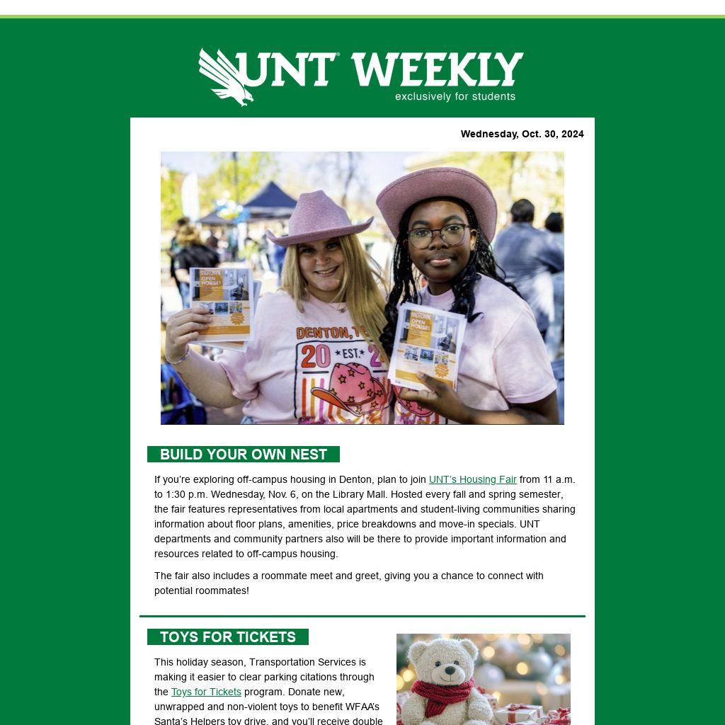 If you’re exploring off-campus housing in Denton, plan to join UNT’s Housing Fair from 11 a.m. to 1:30 p.m. Wednesday, Nov. 6, on the Library Mall. Hosted every fall and spring semester, the fair features representatives from local apartments and student-living communities sharing information about floor plans, amenities, price breakdowns and move-in specials. UNT departments and community partners also will be there to provide important information and resources related to off-campus housing.