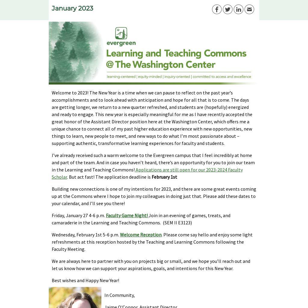 I’ve already received such a warm welcome to the Evergreen campus that I feel incredibly at home and part of the team. And in case you haven’t heard, there’s an opportunity for you to join our team in the Learning and Teaching Commons! Applications are still open for our 2023-2024 Faculty Scholar. But act fast! The application deadline is February 1st