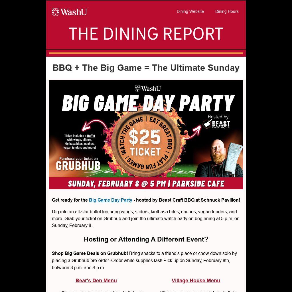 Shop Big Game Deals on Grubhub! Bring snacks to a friend's place or chow down solo by placing a Grubhub pre-order. Order while supplies last! Pick up on Sunday, February 8th, between 3 p.m. and 4 p.m.