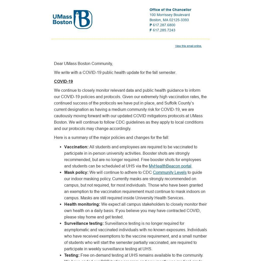 We continue to closely monitor relevant data and public health guidance to inform our COVID-19 policies and protocols. Given our extremely high vaccination rates, the continued success of the protocols we have put in place, and Suffolk County’s current designation as having a medium community risk for COVID-19, we are cautiously moving forward with our updated COVID mitigations protocols at UMass Boston. We will continue to follow CDC guidelines as they apply to local conditions and our protocols may change accordingly.