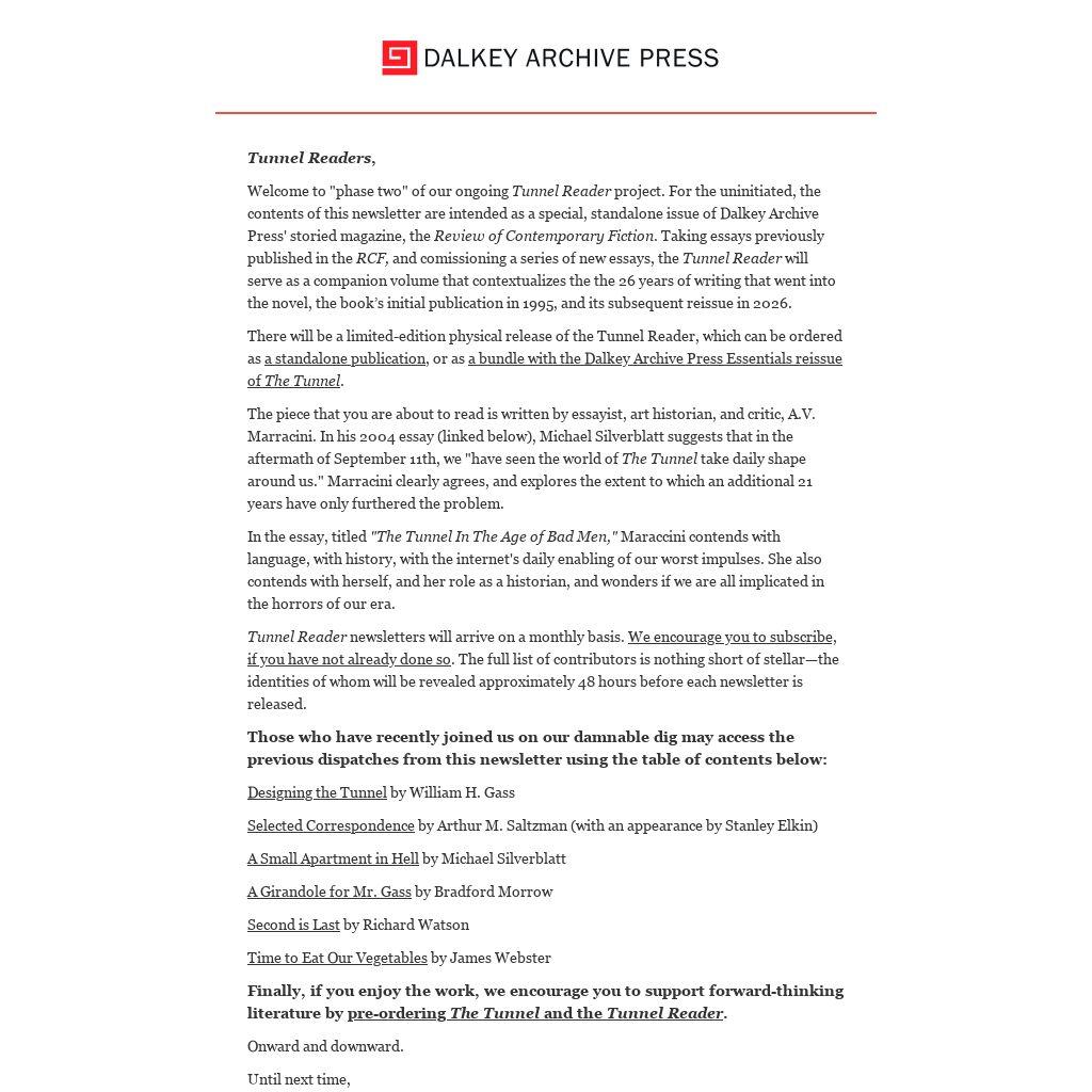 I don’t know. I’m procrastinating. I’m digging the hole that is this essay, that likely constitutes no meaningful act of resistance to fascism, that is in and of itself, a lack, an emptiness below abasement. In the Age of Bad Men, sitting in our reading chairs with The Tunnel, does that makeus any less complicit?