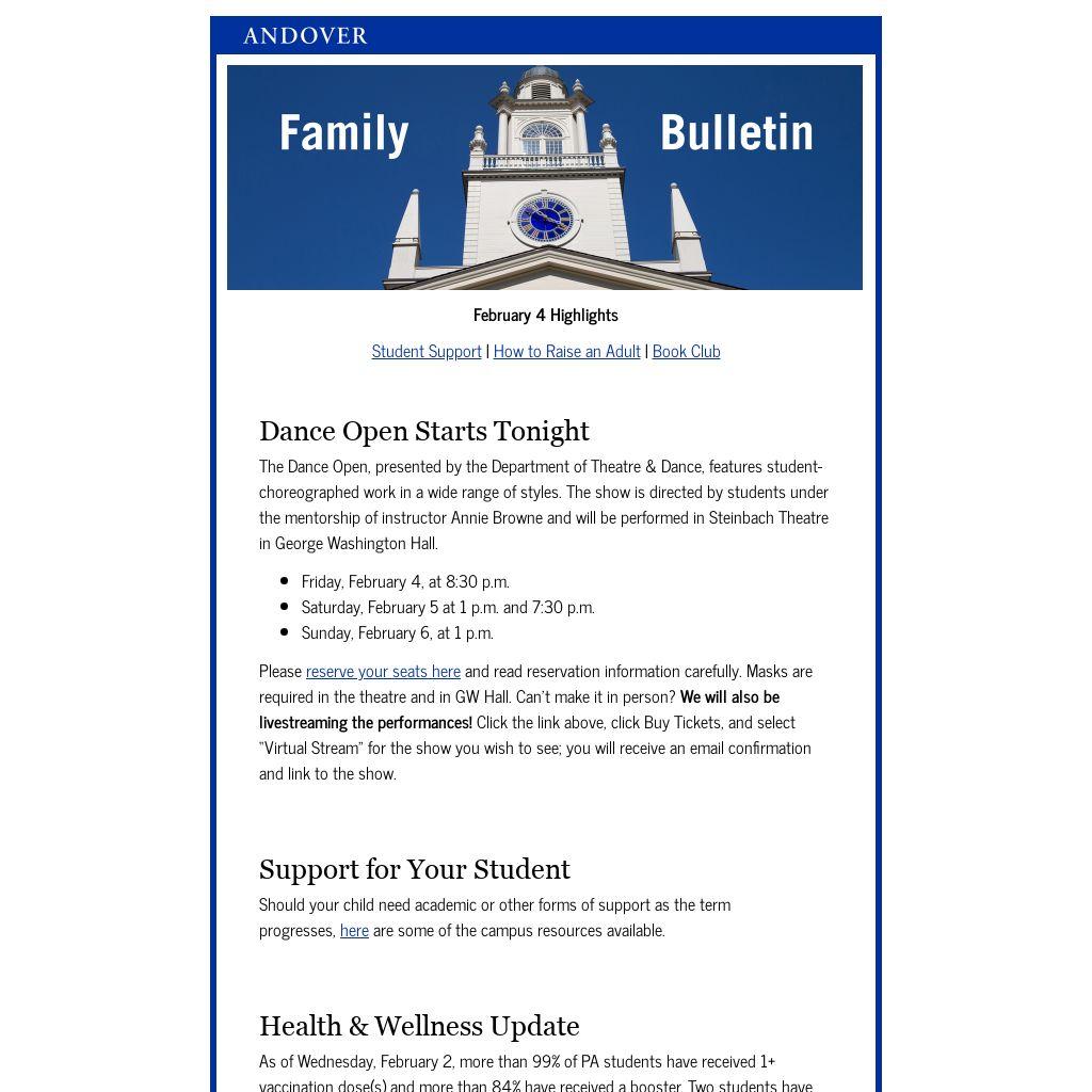 Please check the Events Calendar on Andover’s website regularly for additional in-person and online events that may be open to families. The Weekender is the Academy’s one-stop guide to weekend student activities, opportunities, club-organized events, guest speakers, performances, and athletic contests.