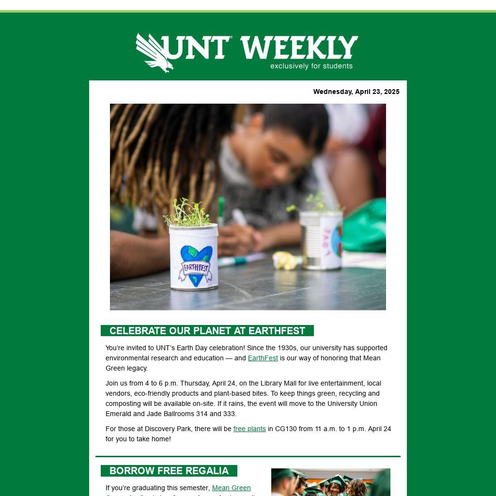 You’re invited to UNT’s Earth Day celebration! Since the 1930s, our university has supported environmental research and education — and EarthFest is our way of honoring that Mean Green legacy.