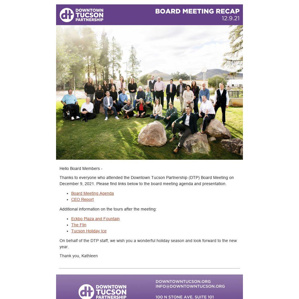 Thanks to everyone who attended the Downtown Tucson Partnership (DTP) Board Meeting on December 9, 2021. Please find links below to the board meeting agenda and presentation.