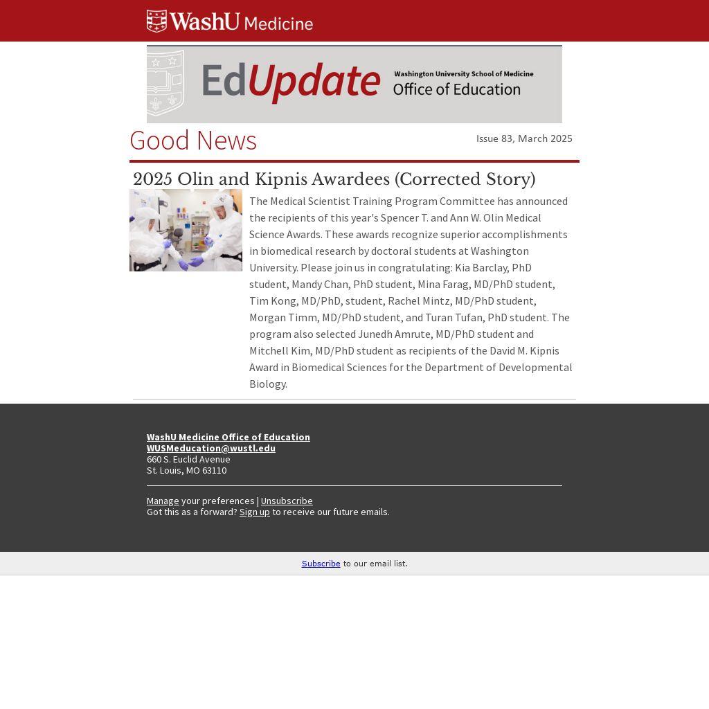 The Medical Scientist Training Program Committee has announced the recipients of this year's Spencer T. and Ann W. Olin Medical Science Awards. These awards recognize superior accomplishments in biomedical research by doctoral students at Washington University. Please join us in congratulating: Kia Barclay, PhD student, Mandy Chan, PhD student, Mina Farag, MD/PhD student, Tim Kong, MD/PhD, student, Rachel Mintz, MD/PhD student, Morgan Timm, MD/PhD student, and Turan Tufan, PhD student. The program also selected Junedh Amrute, MD/PhD student and Mitchell Kim, MD/PhD student as recipients of the David M. Kipnis Award in Biomedical Sciences for the Department of Developmental Biology.