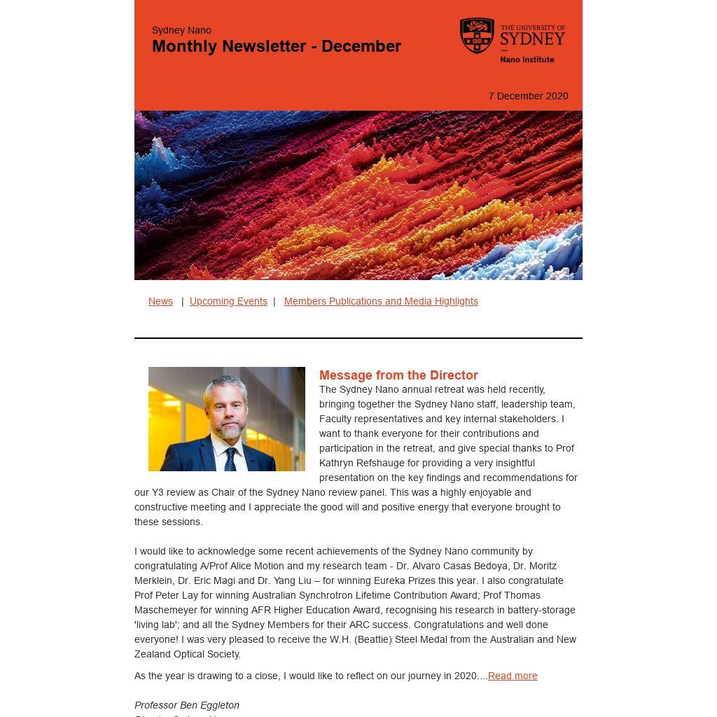 I would like to acknowledge some recent achievements of the Sydney Nano community by congratulating A/Prof Alice Motion and my research team - Dr. Alvaro Casas Bedoya, Dr. Moritz Merklein, Dr. Eric Magi and Dr. Yang Liu – for winning Eureka Prizes this year. I also congratulate Prof Peter Lay for winning Australian Synchrotron Lifetime Contribution Award; Prof Thomas Maschemeyer for winning AFR Higher Education Award, recognising his research in battery-storage 'living lab'; and all the Sydney Members for their ARC success. Congratulations and well done everyone! I was very pleased to receive the W.H. (Beattie) Steel Medal from the Australian and New Zealand Optical Society.