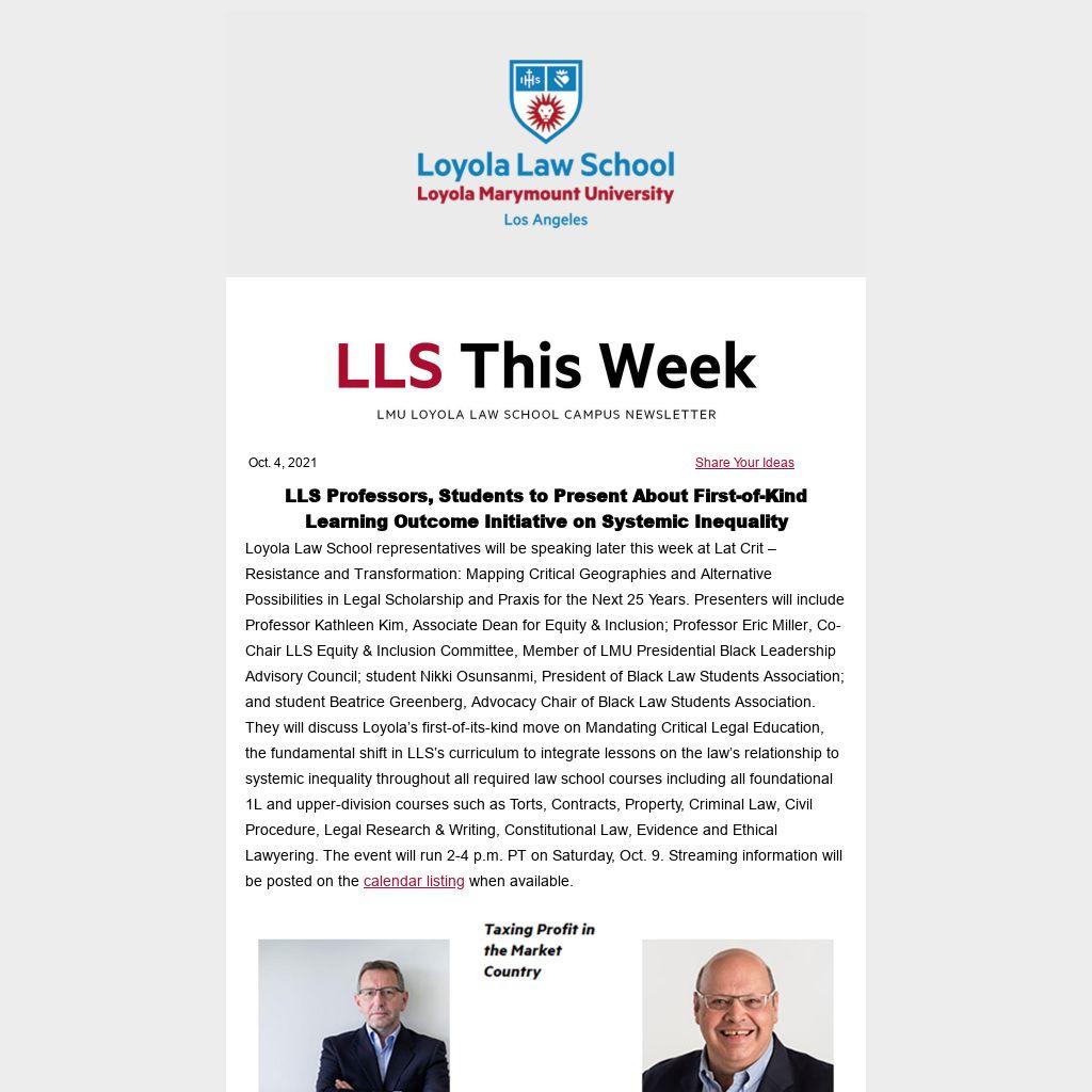 LLS Professors, Students to Present About First-of-Kind Learning Outcome Initiative on Systemic InequalityLoyola Law School representatives will be speaking later this week at Lat Crit – Resistance and Transformation: Mapping Critical Geographies and Alternative Possibilities in Legal Scholarship and Praxis for the Next 25 Years. Presenters will include Professor Kathleen Kim, Associate Dean for Equity & Inclusion; Professor Eric Miller, Co-Chair LLS Equity & Inclusion Committee, Member of LMU Presidential Black Leadership Advisory Council; student Nikki Osunsanmi, President of Black Law Students Association; and student Beatrice Greenberg, Advocacy Chair of Black Law Students Association. They will discuss Loyola’s first-of-its-kind move on Mandating Critical Legal Education, the fundamental shift in LLS’s curriculum to integrate lessons on the law’s relationship to systemic inequality throughout all required law school courses including all foundational 1L and upper-division courses such as Torts, Contracts, Property, Criminal Law, Civil Procedure, Legal Research & Writing, Constitutional Law, Evidence and Ethical Lawyering. The event will run 2-4 p.m. PT on Saturday, Oct. 9. Streaming information will be posted on the calendar listing when available.